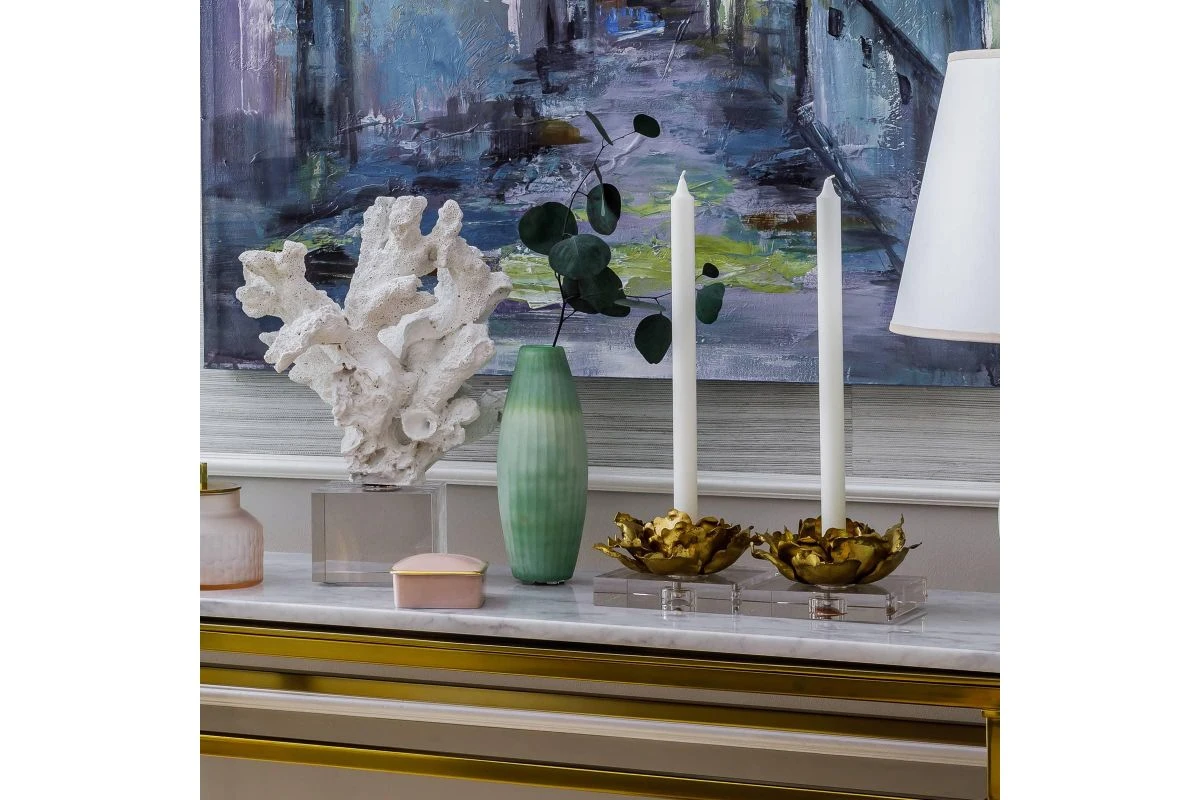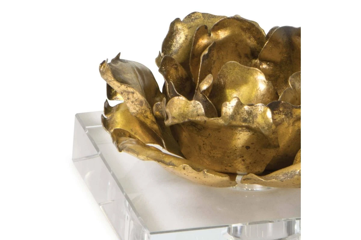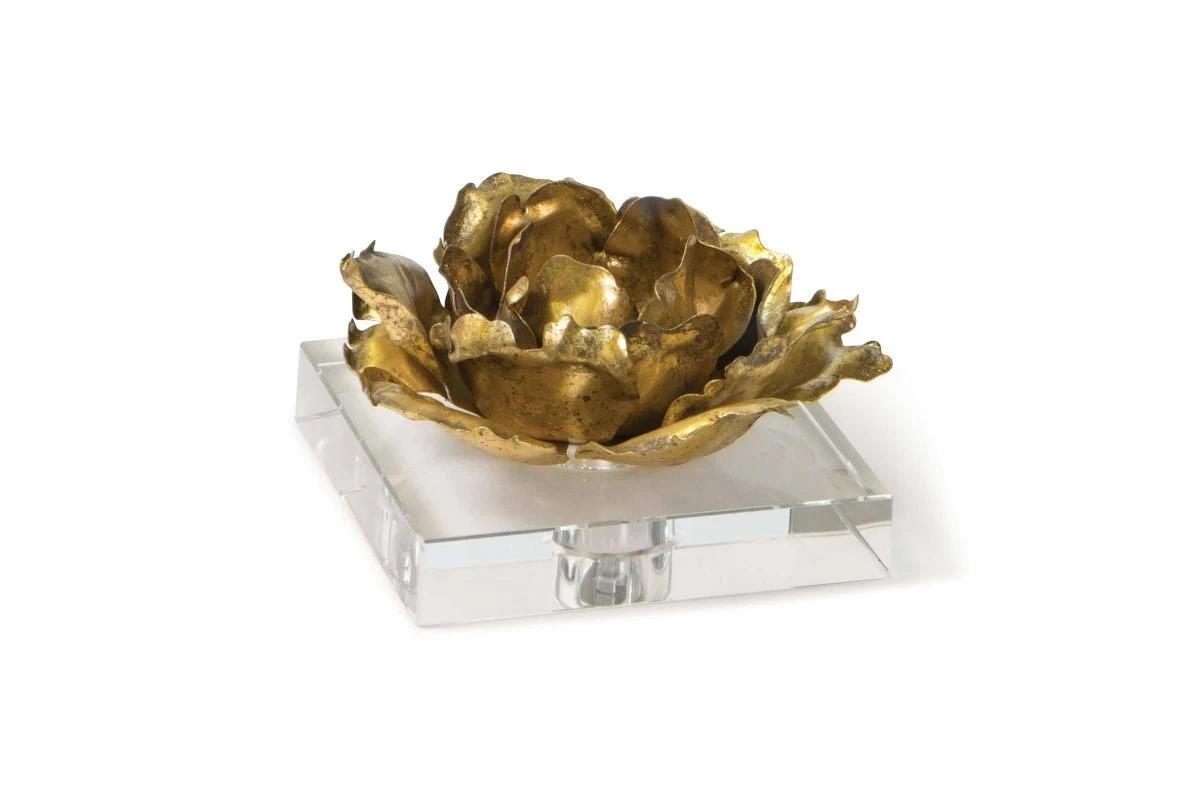Boasting gold blossom-like accents this piece is a forward-thinking work of art. Placed on top of crystal base completes the glamorous look. For added elegance a single tapered candle can be inserted to the center of flower to illuminate your space.