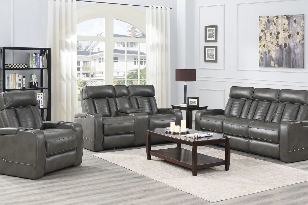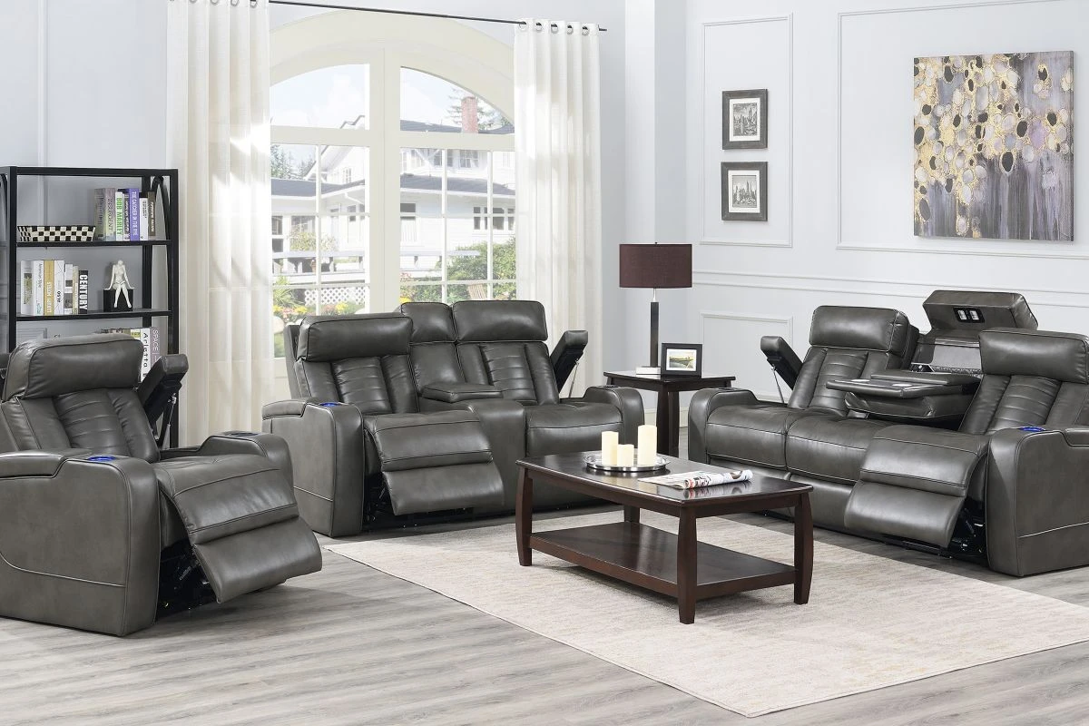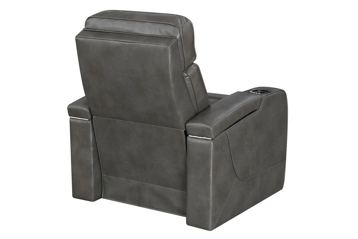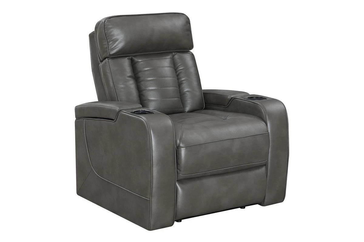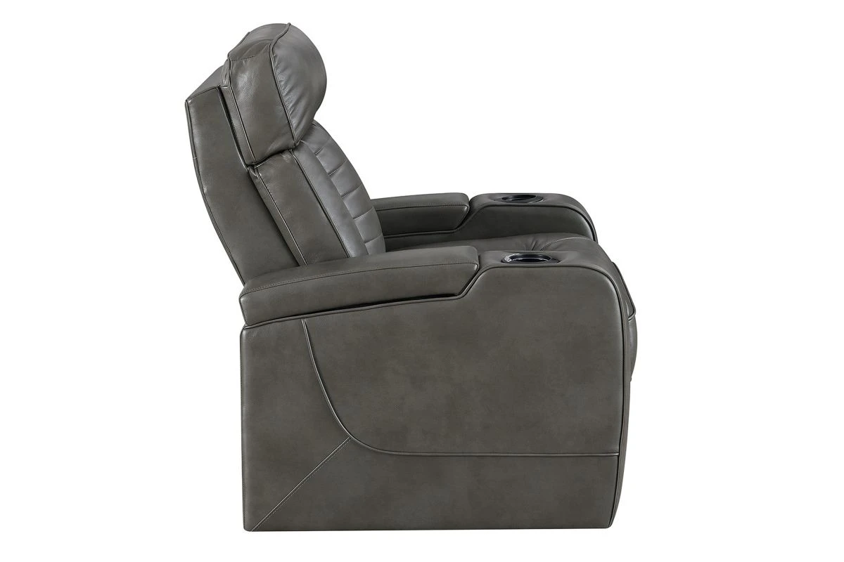 Stylish, innovative and comfortable, the Alpha Dual Power Recliner as it all. Upholstered in a grey faux leather, the soft hand of this fabric will entice you to relax for hours. Equipped with a fully loaded hidden storage armrests, and light up cupholders this recliner is both innovative anfd comfortable. The luxury vehicle inspired backrest adds visual appeal to this bold and handsome recliner. Add the Alpha Dual Power Recliner to your home for the theater-worthy living space that you have been longing for.