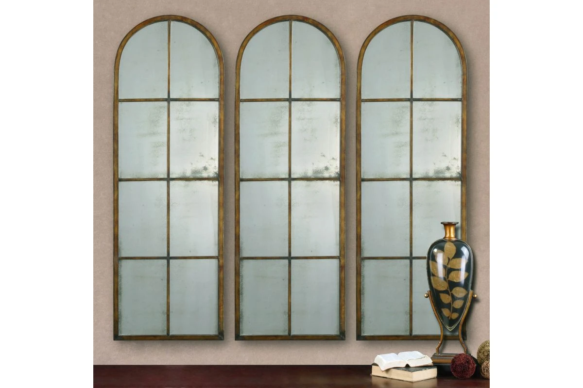 This Antiqued Mirror Features A Hand Forged Metal Frame Finished In A Heavy, Maple Brown Wash With Gold Highlights And Burnished Details. Sold Individually. Shown Are Three Pieces Of #13463.
