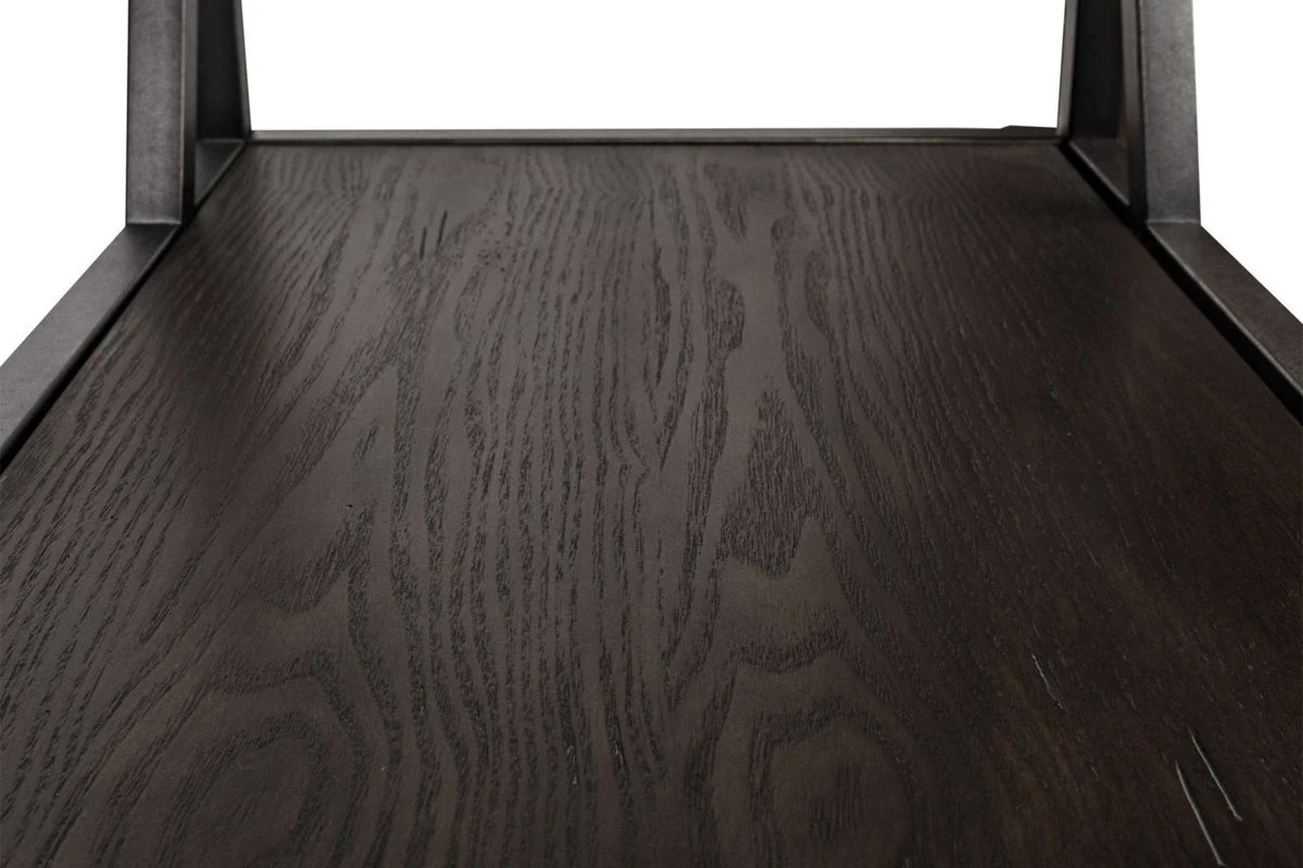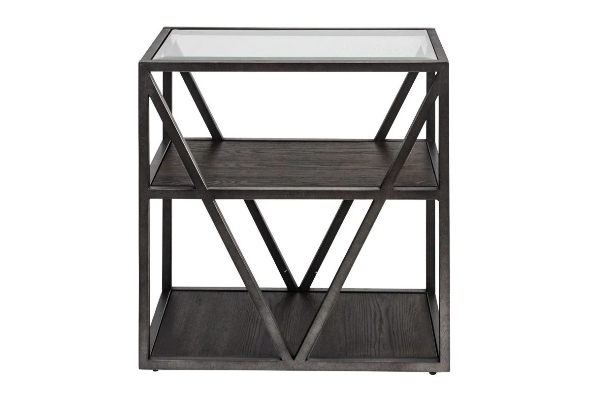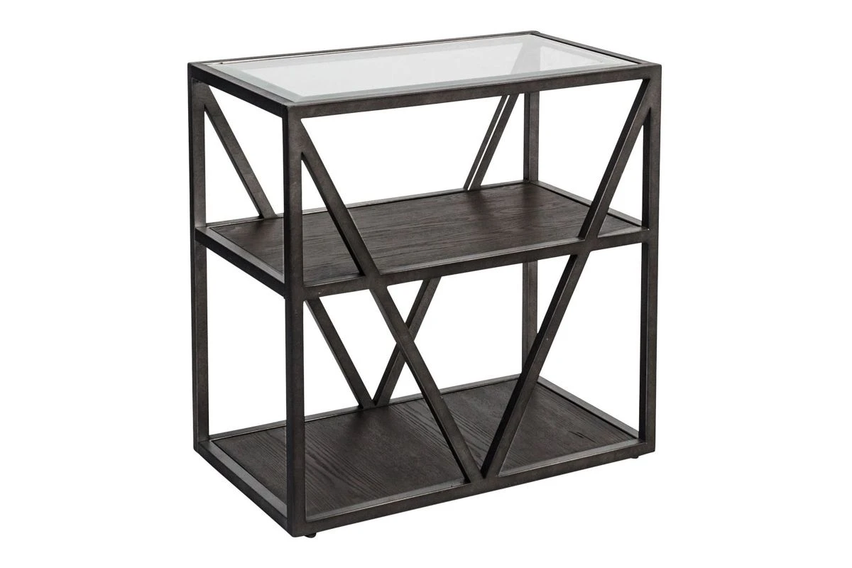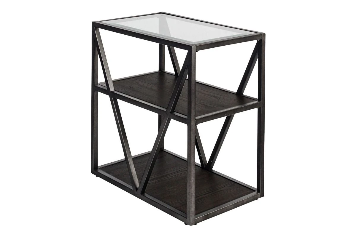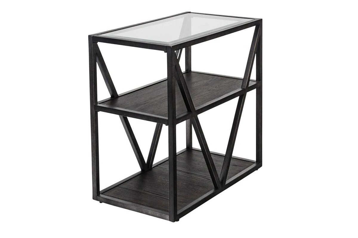 Accent your space with the urban living Arista chair side table. Crafted of ash veneer and metal tube framing, this piece features a cobblestone brown finish with gray dusty wax hang up, two floating wood shelves for additional storage, a beveled glass top, anchored by a metal framed V shape design. This one of a kind table will pair well with any rustic, casual or contemporary space.