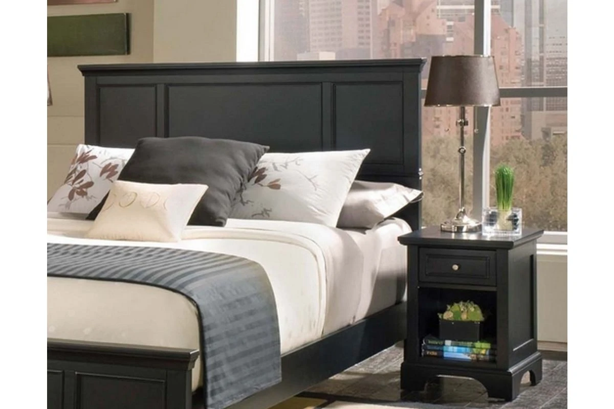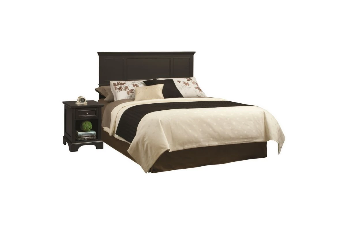 homestyles Ashford King Headboard and Nightstand are constructed of hardwood solids and engineered wood with a rich ebony finish. Headboard features include raised panels on the headboard. Headboard will fit most King bed frames. Item Size: 80.75w 2.5d 52h. Nightstand features include a storage drawer that measures 10.75 10.75d 4h, and open storage area that measures 12w 14d 11.5h. Item measures: 18w 16d 24h
