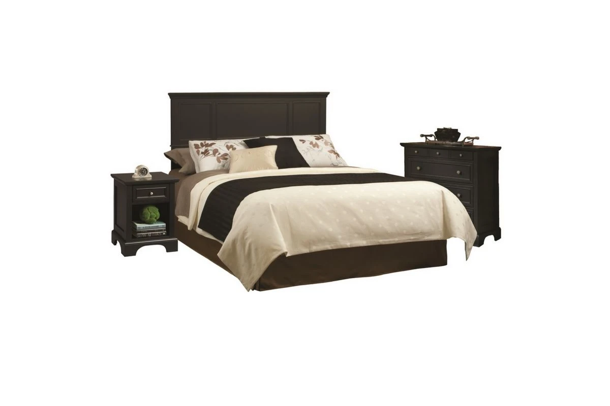 homestyles Ashford King Headboard, Nightstand, and Chest are constructed of hardwood solids and engineered wood with a rich ebony finish. Headboard features include raised panels on the headboard. Headboard will fit most King bed frames. Item Size: 80.75w 2.5d 52h. Nightstand features include a storage drawer that measures 10.75w 10.75d 4h, and open storage area that measures 12w 14d 11.5h. Item measures: 18w 16d 24h. Chest features include four large drawers. Top drawer measures 28w 13d 2h the remaining drawers measure 28w 13d 6.5h. Item measures: 36w 16.5d 36h