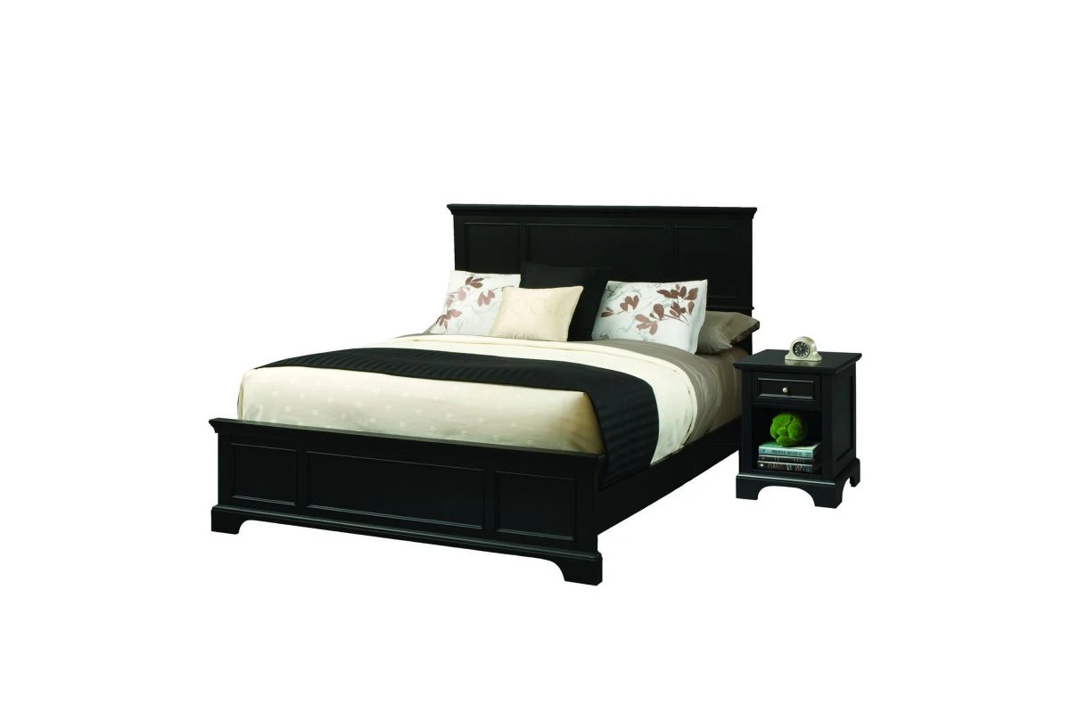 homestyles Ashford Queen Bed and Nightstand is constructed of hardwoods and engineered wood in a rich ebony finish. Bed Features include raised panels on the headboard and footboard. Item includes Queen headboard, footboard, and rails. Item Size: 64.75w 87d 52h. Nightstand features include a storage drawer that measures 10.75 w 10.75 d 4h, and open storage area that measures 12w 14d 11.5 h. Item measures: 18w 16d 24h.