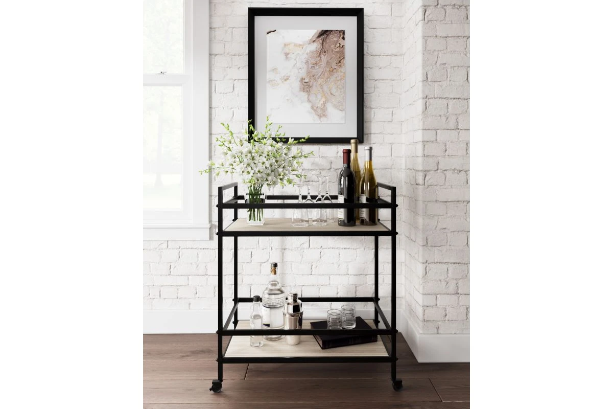 Display your favorite beverages with this rolling bar cart. Constructed of metal in a black finish with wood grain effect melamine shelves, this cart blends easily with your existing living room aesthetic. A protective rail surrounds the shelves, keeping bottles and glasses from spilling. Lockable casters serve up drinks and snacks in style.