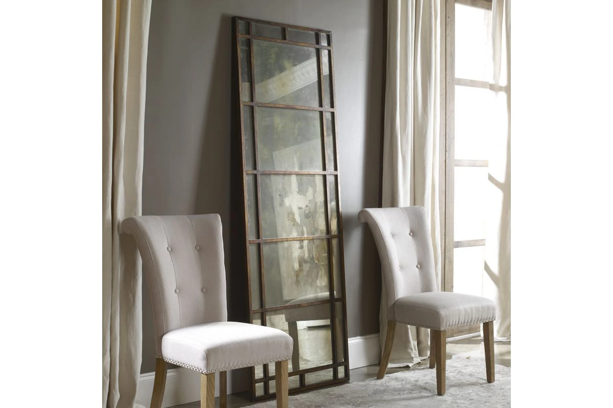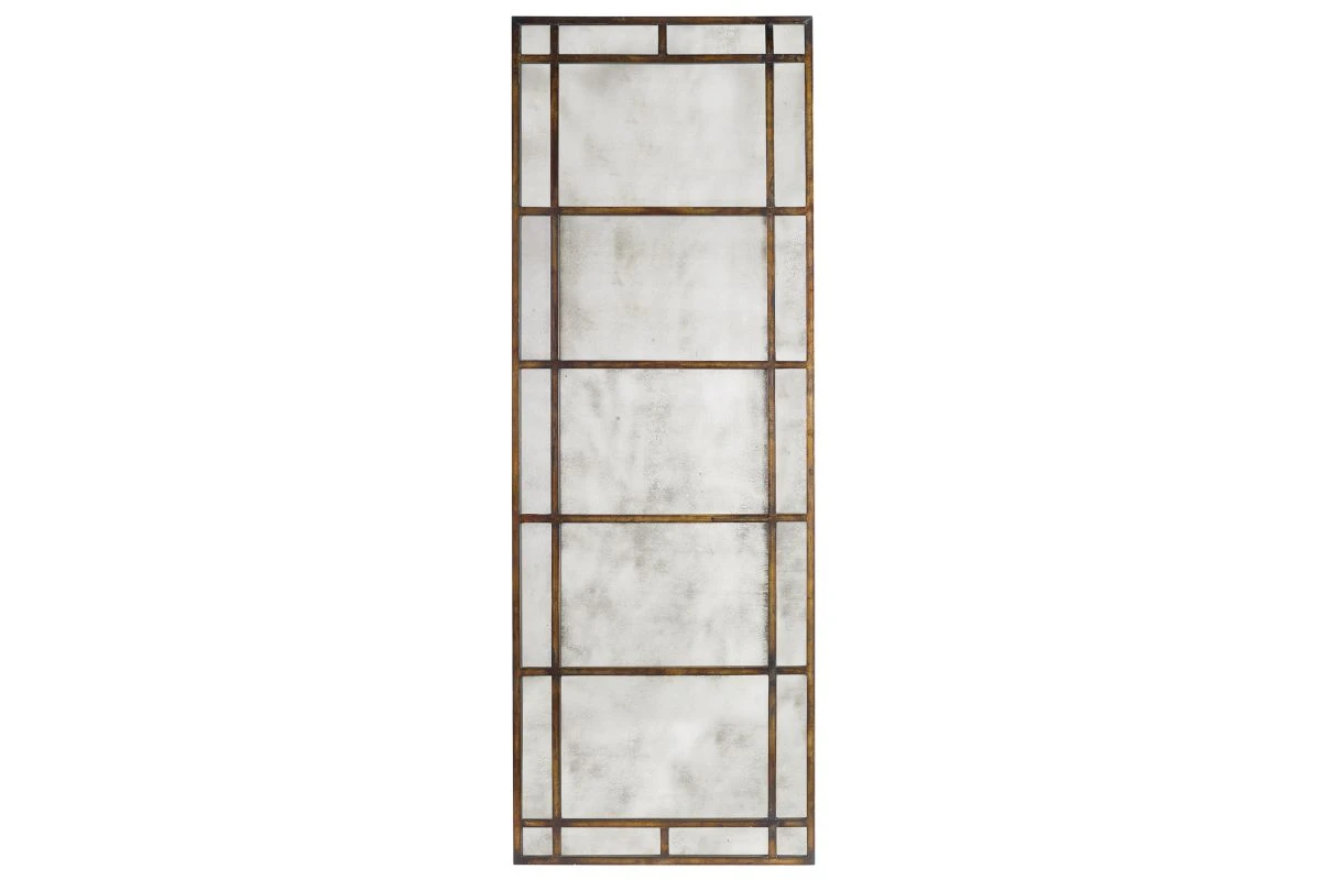 This Mirror Features A Narrow Metal Frame Finished In Heavily Antiqued Rustic Bronze With Antiqued Style Mirrors. May Be Hung Horizontal Or Vertical.