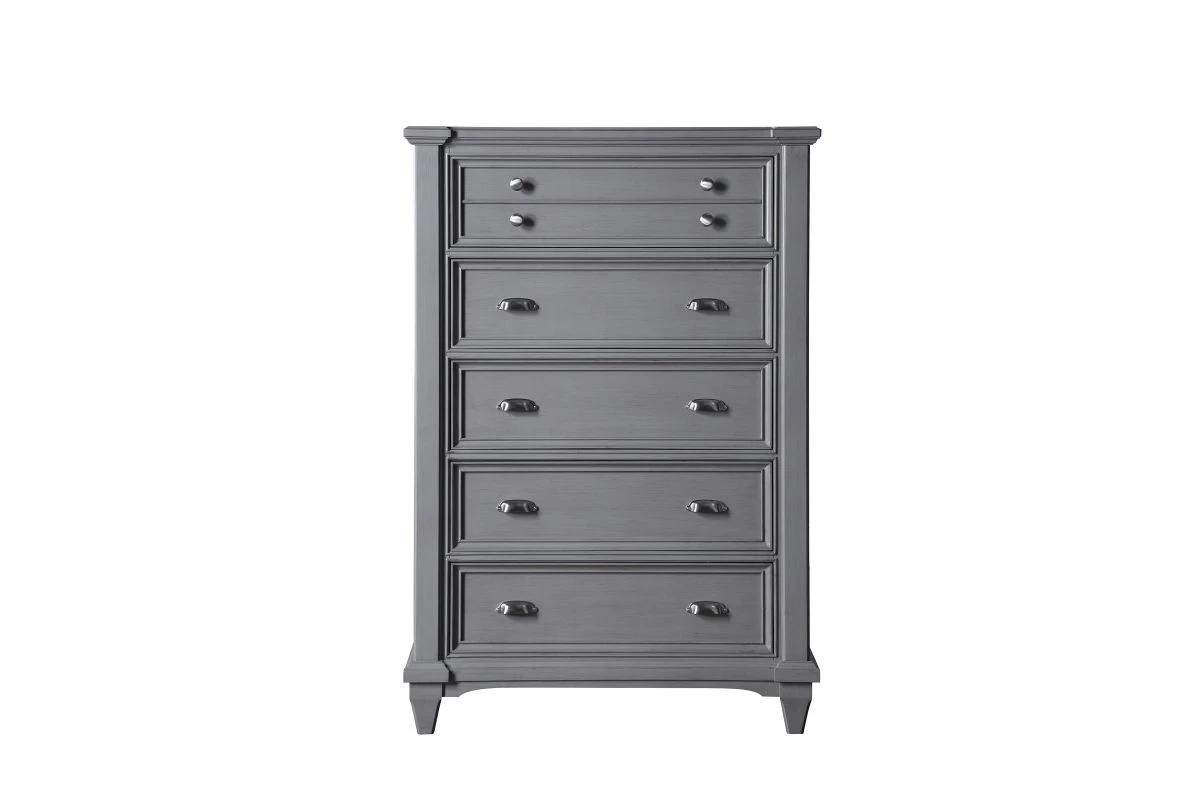 Classic cottage styling and a lovely Grey finish make the Bay Harbor chest an eye pleasing and practical addition to your bedroom. Five drawers are crafted with strong English and French dovetail construction and completed with brushed nickel hardware.