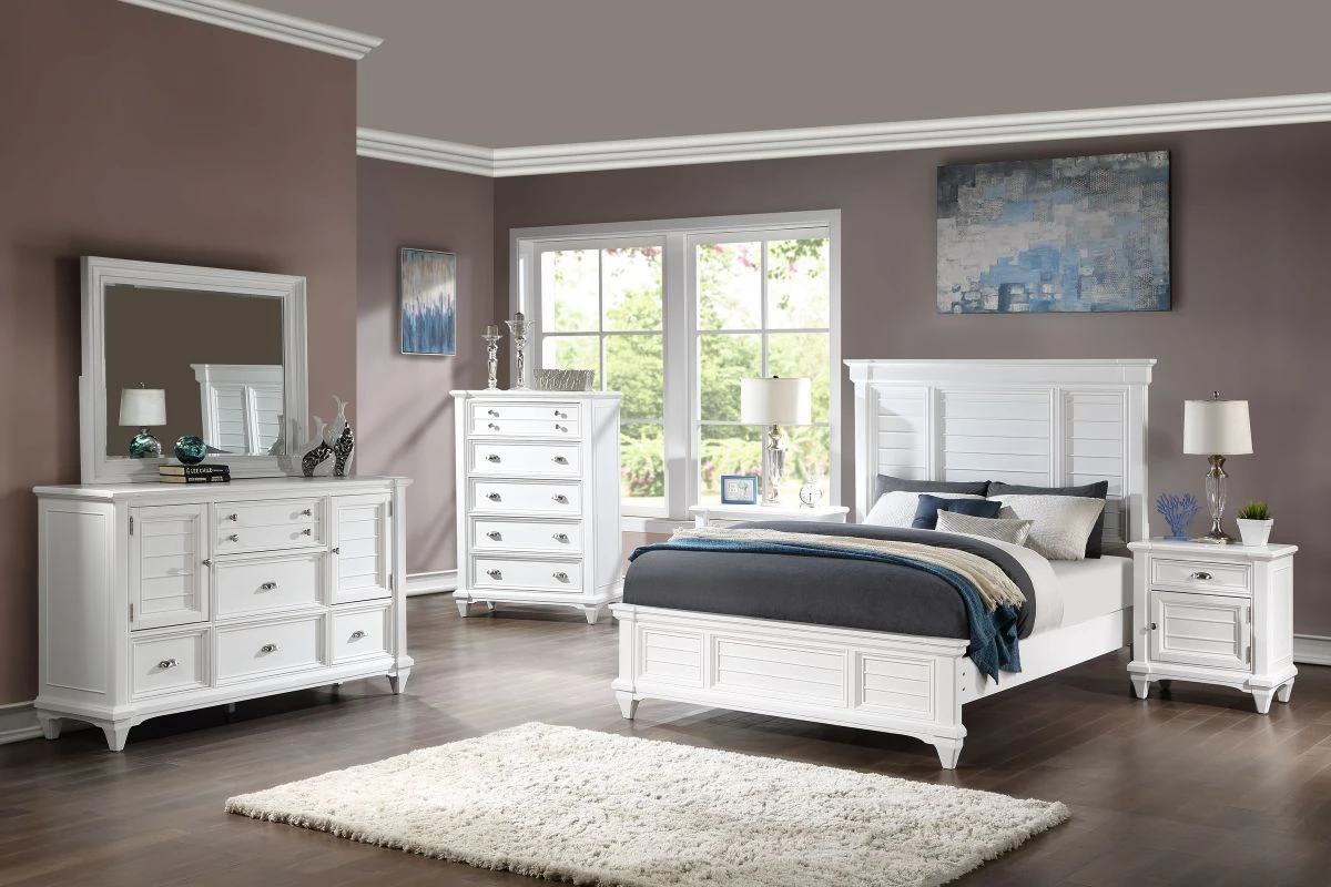 Classic cottage styling and a lovely white finish make the Bay Harbor chest an eye pleasing and practical addition to your bedroom. Five drawers are crafted with strong English and French dovetail construction and completed with brushed nickel hardware.