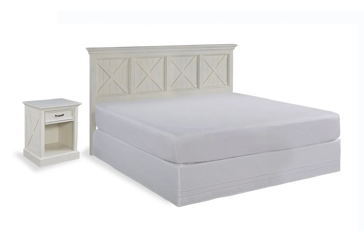 Rustic aged look of weathered wood combined with signature “X” frame pattern provides a warm inviting cottage feel. Delivered to your door by parcel post service. Wire brushed wainscot inset mahogany veneer panels, with wire brushed solid mahogany frame, provide a unique weather look, and then combined with a hand rubbed white painted finish, provides a completely aged look, with no 2 pieces being the same. Holes provided for attachment to most metal bed frames, for both standard king size, or California King frames, hardware not included. Nightstand features a single 3.25″ deep drawer, with lower open storage area. Industrial designed drawer pull in antiqued nickel finish. Note: Finish and measurements may vary slightly. Assembly required, Headboard: W-83″, D-4″, H-50″, Nightstand: W-22″, D-17″, H-26″