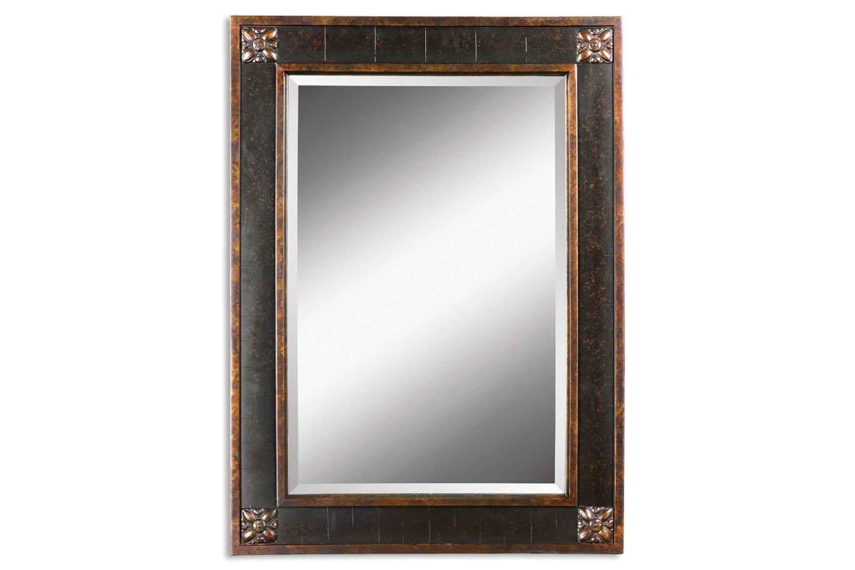 Frame Features A Distressed Chestnut Brown Finish With Mottled Black Undertones, Gold Leaf Details And A Light Tan Glaze. Mirror Has A Generous 1 1/4″ Bevel.