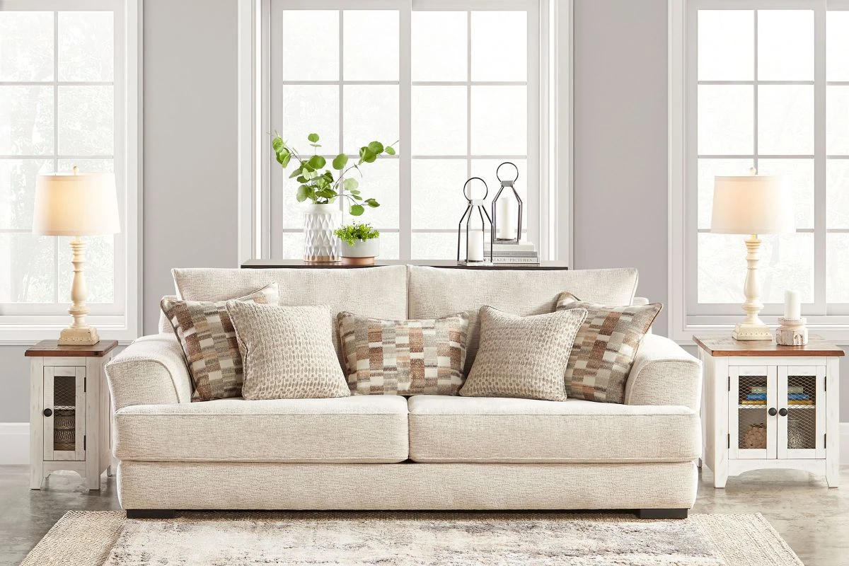 The Blaire Sofa is here to make your living room or family room the most serene place in the home. Covered in a soft, neutral fabric and finished with on-trend toss pillows, this collection is both on-trend and ultra comfortable. Reversible seat cushions allow for added years of comfort and include D rings so you can attach to the frame. Sofa, loveseat and chair all come with coordinating pillows to add to the decor of your home.