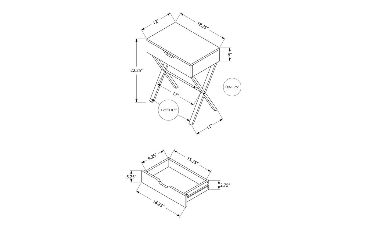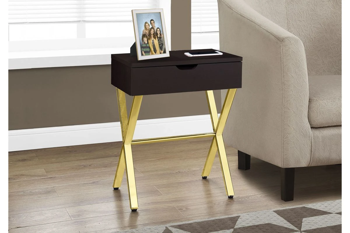 Influenced by the design accomplishments of the past, this mid-century inspired table has gone through a modern make-over. The iconic lines and styling of this side table paired with the sophisticated cappuccino finish and gold metal X base legs, give this table an edgy look that will complete your modern room setting. This versatile table can be used as an accent table in the den, living room or entryway or as a nightstand in the bedroom. Featuring one storage drawer with a cut-out handle, this sturdy accent table is perfect to display your favourite objects and keeping things organized in one place.