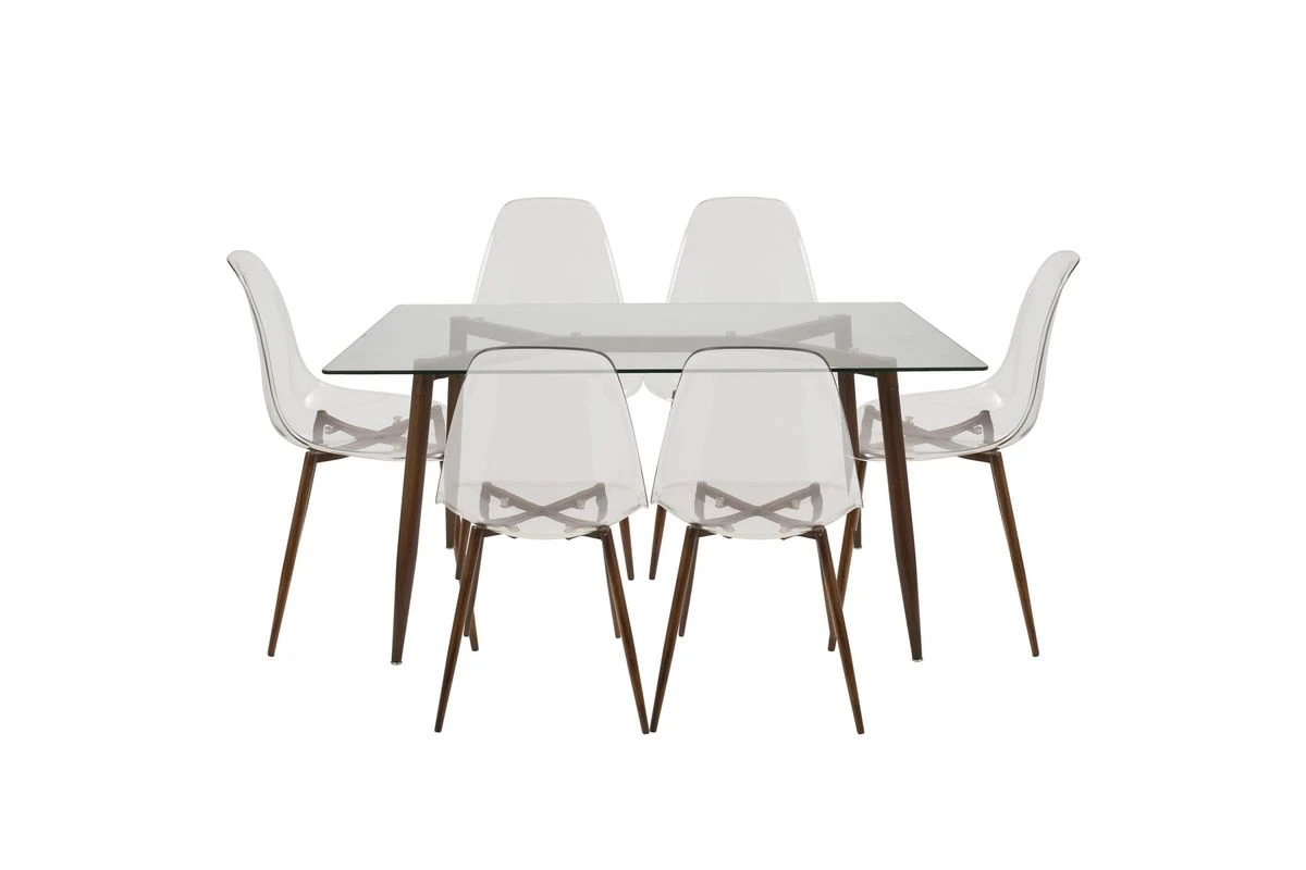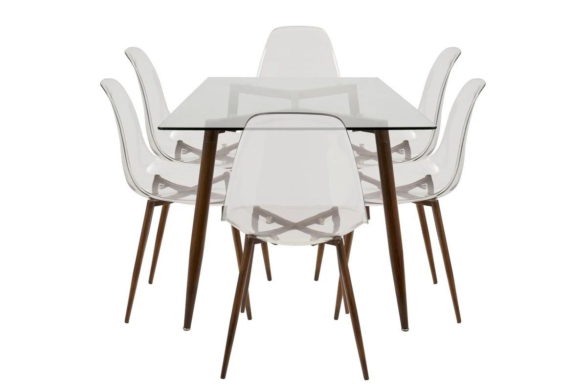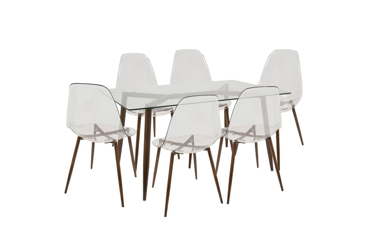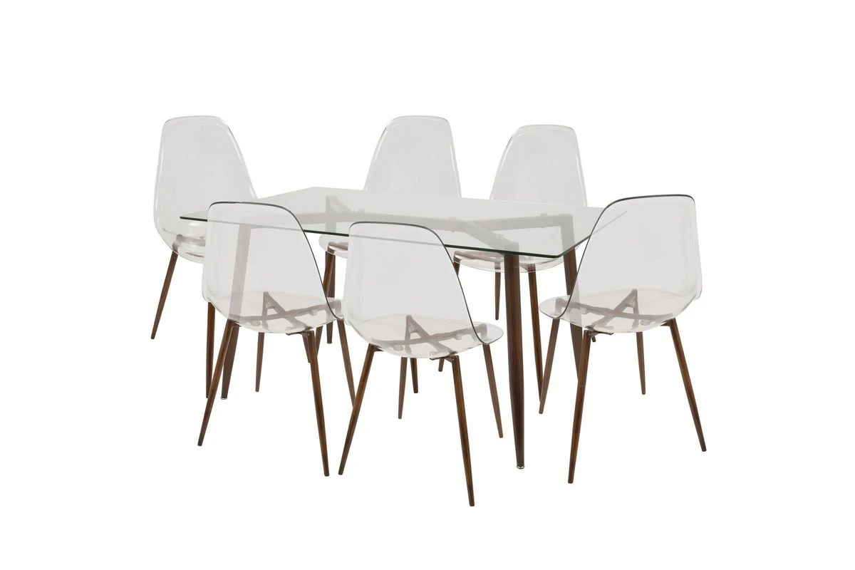 With a simple and sleek table, and an accent of comfortable chairs, the Clara Dining Set will be a great addition to a modern kitchen or break room. With their geometric legs and clear sleek tops, the Clara Dining Set will be an eye catcher in any setting.