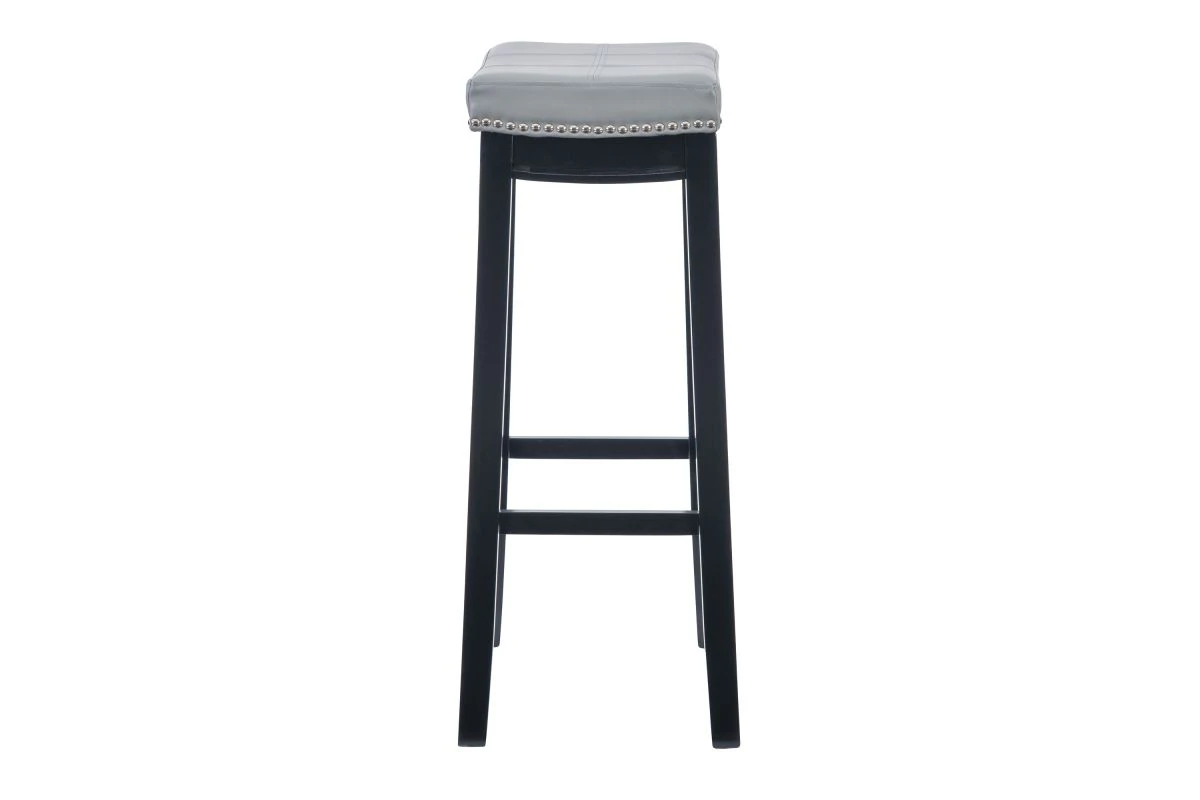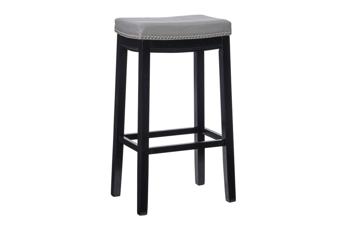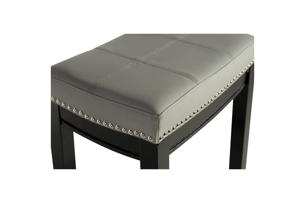This Gray Counter Stool will add stylish seating to any counter or high top table in your home. The sturdy wood frame has a black finish accented by a gray faux leather upholstered seat. Silver nail head trim and double needle stitching adds durability to the padded top for and eye catching detail. 26″ Seat Height. 275 pound weight limit.