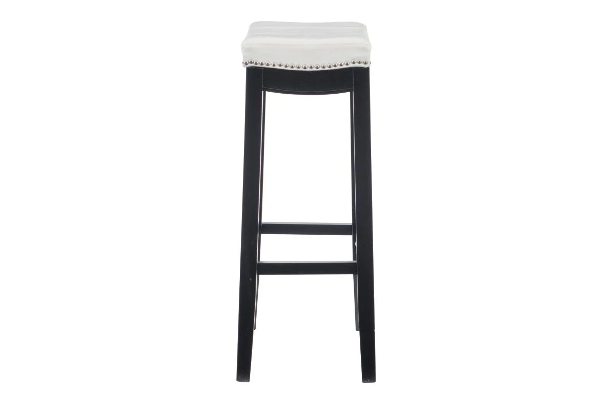 This White Bar Stool will add stylish seating to any counter or high top table in your home. The sturdy wood frame has a black finish accented by a white faux leather seat. Silver nail head trim and double needle accent stitching adds durability to the padded top for an eye catching detail. 32.5″ Seat Height. 275 pound weight limit.