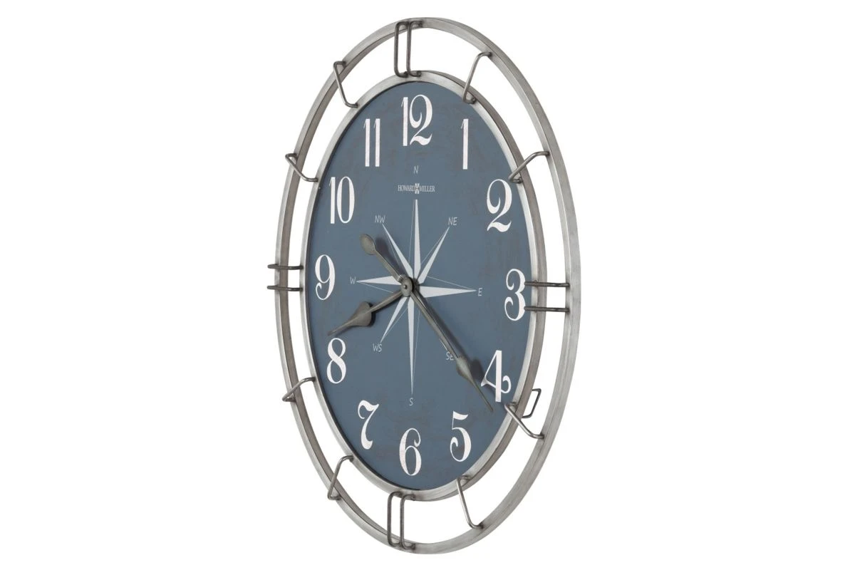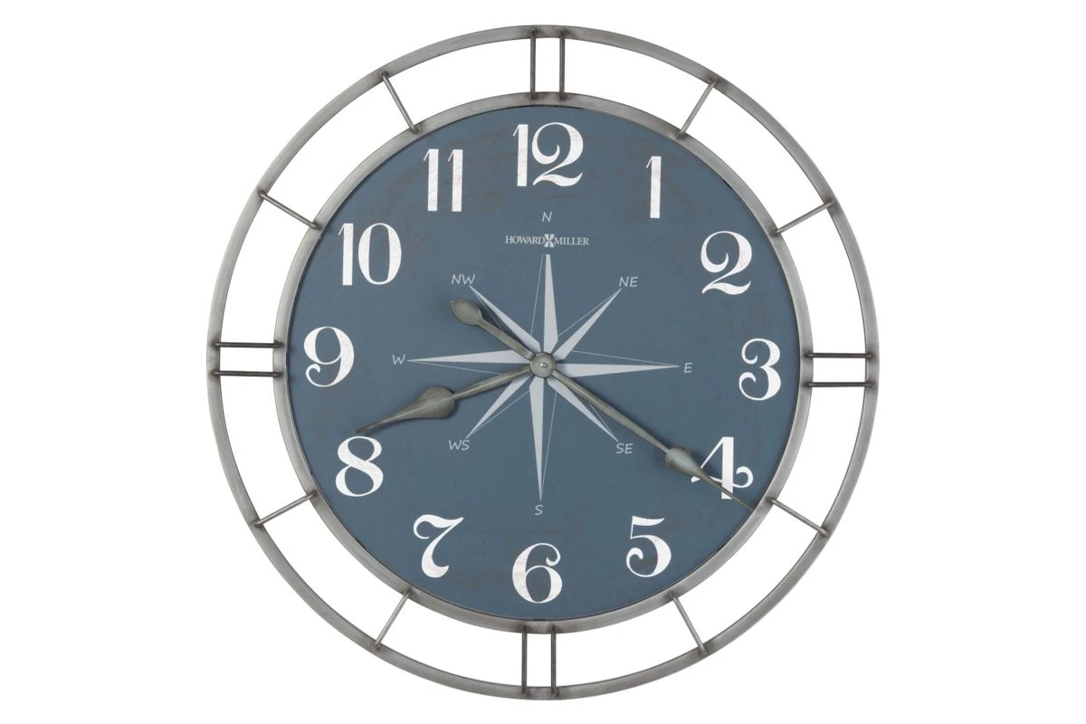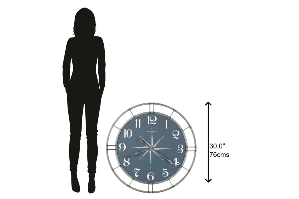 Display the Compass Dial oversized wall clock in any room. It’s crafted from wrought iron for durability and rustic style, and the center is adorned with a light blue compass rose to impart a nautical touch to your space. This round wall clock has a 30-inch diameter, so it can be used as the focal point for your wall.The frame of this iron wall clock has an aged silver finish for an antique appearance. Aged white Arabic numerals contrast with the aged blue dial, which also has silver-finish hands for a complementary look.