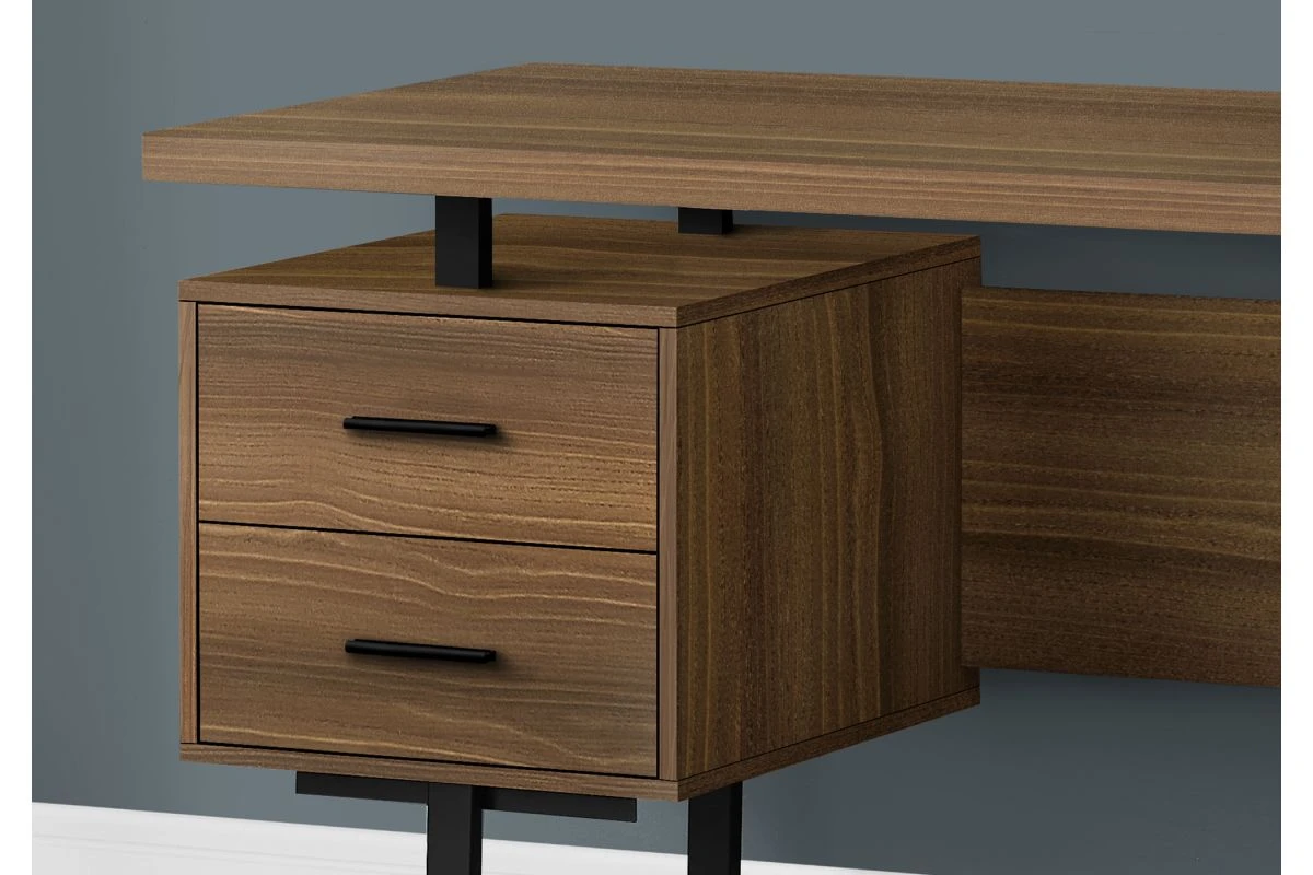 Feel like a boss in your home office when you sit down to work at this mid-size computer desk with 3 storage drawers. The thick-panel floating desktop provides generous room for a laptop and writing materials, and allows you to use the tops of the drawer units as extra surfaces. Finished in the same walnut wood-look laminate as the desktop, 2 small drawers and 1 large drawer with a bar for hanging files offer space for items you want to keep off the work surface. For flexibility, the drawer units are reversible and can be installed on either side according to your preference. Supporting the desk are metal legs in a black finish with a modern, stylish U shape.
