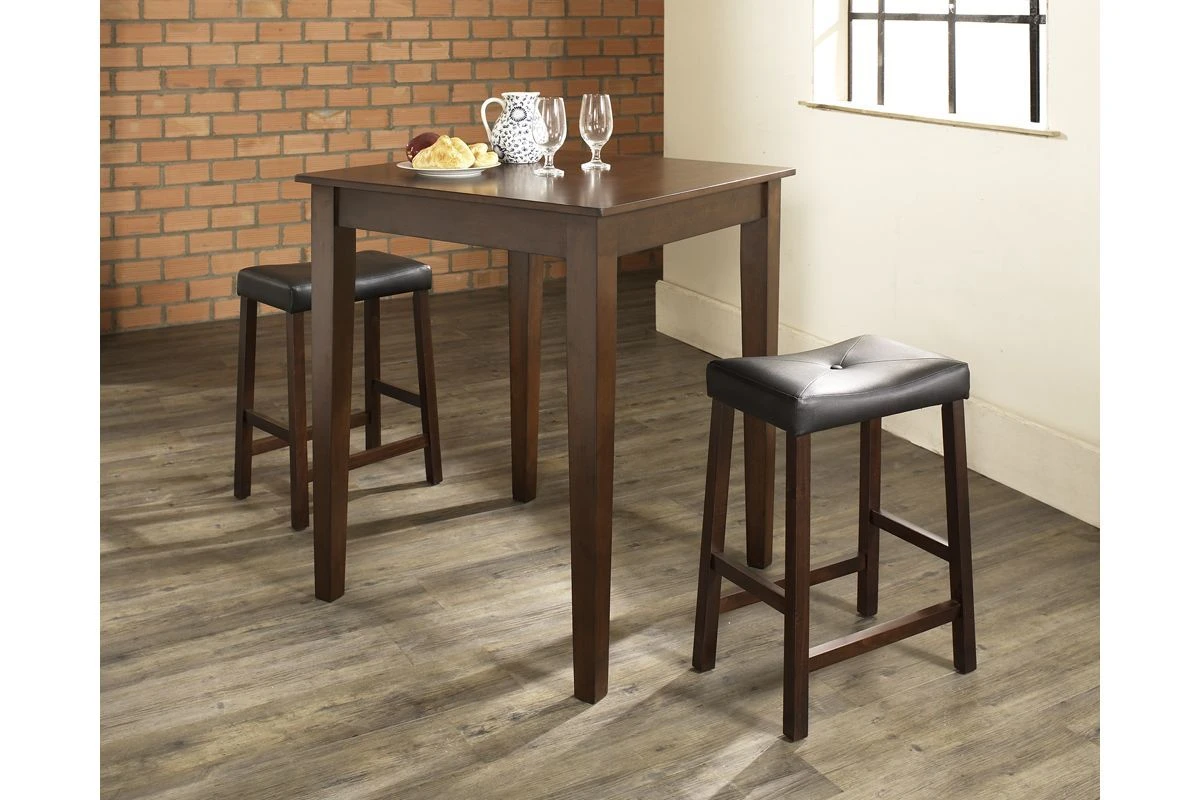 Crosley 3 Piece Pub Dining Set With Upholstered Saddle Stools In Vintage Mahogany