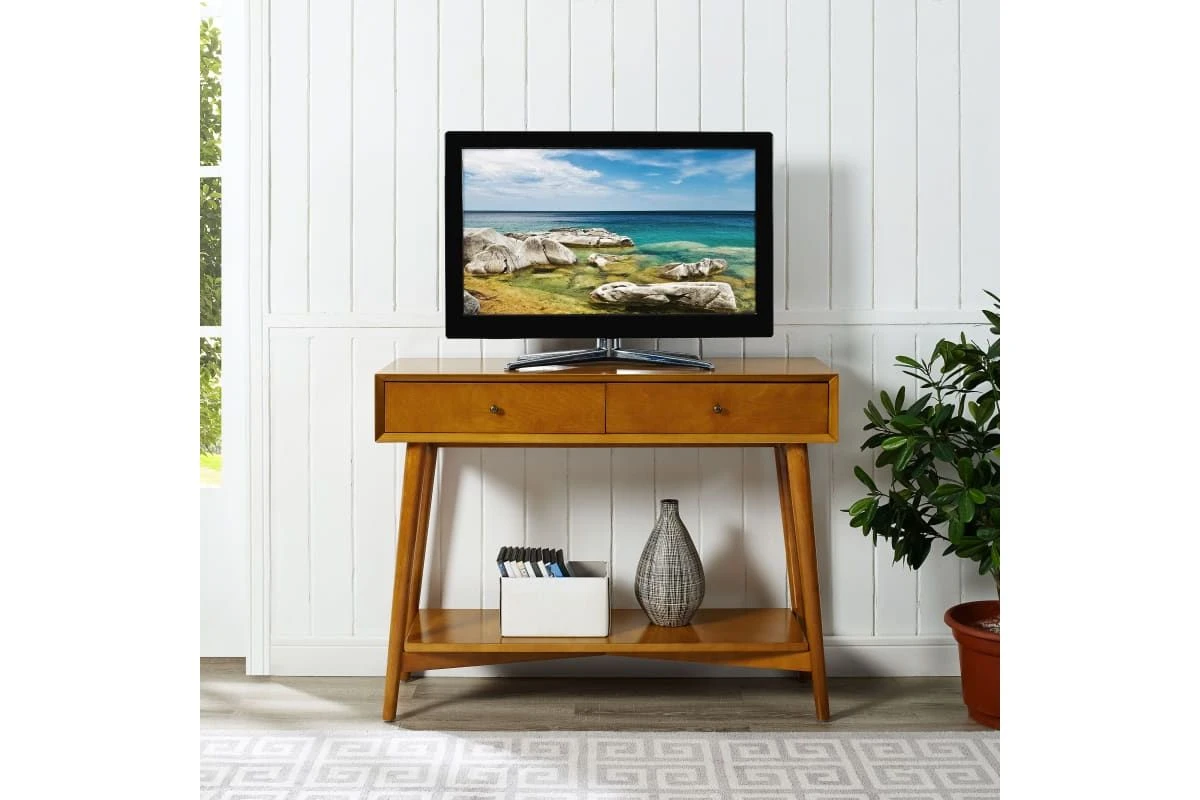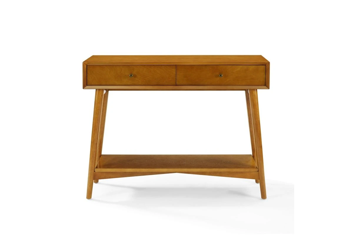 Add some swanky style to your home with the Landon Console Table. This mid-century inspired design is accented with genuine metal hardware and the solid hardwood is finished in warm acorn. This piece is perfect for storing away odds and ends within the two full-extension, pullout drawers, and for displaying collectibles and décor on the planked shelf. This table is a stylish addition to your entryway, living room, or bedroom.