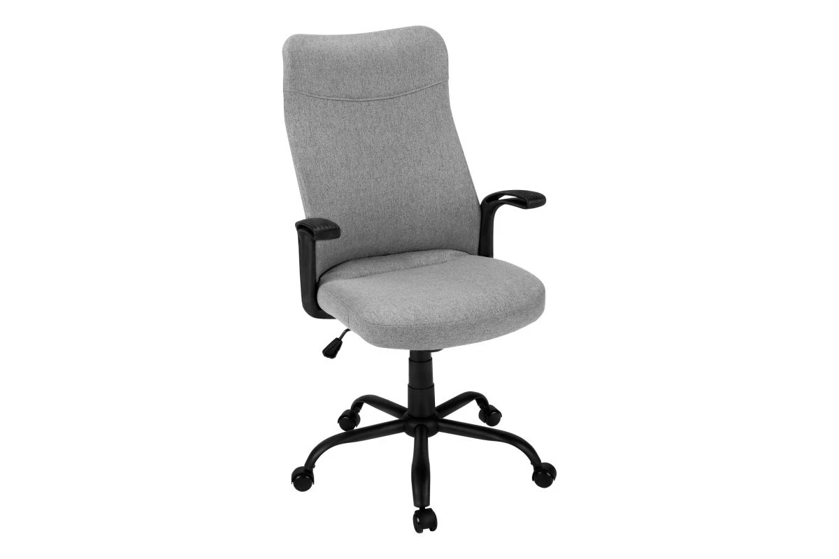 This executive office chair with fixed armrests in black works hard to deliver support and comfort. The ergonomically designed, high backrest with an integrated headrest is lightly padded, wide, and curves to promote good posture, while the padded seat is deep and wide to offer a roomy, comfortable feel. The adjustable height lever with tilt control makes it easy to adjust the chair to your preference. Moving around your workspace is virtually effortless thanks to the swivel seat and the casters on the black 5-star base. Upholstered in a dark grey fabric with minimal stitching, this contemporary task chair provides a comfortable place to sit as you work hard in your office.