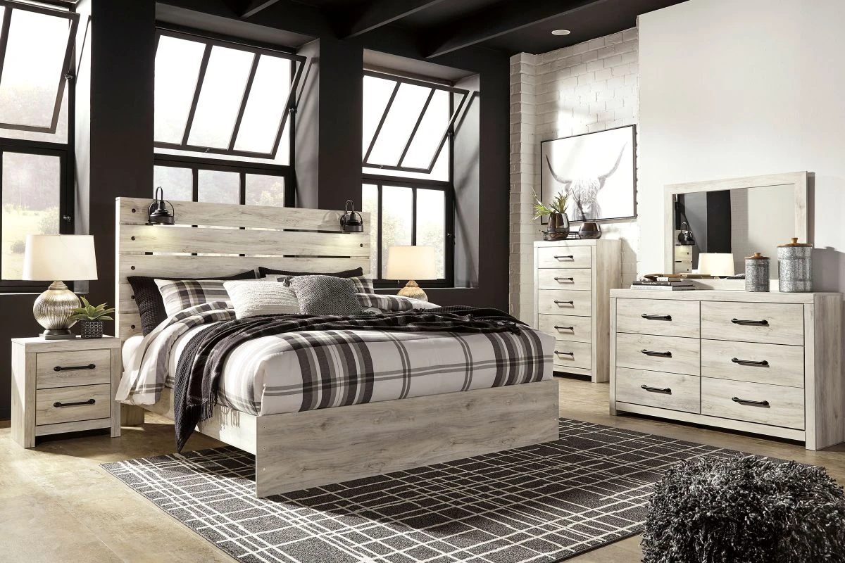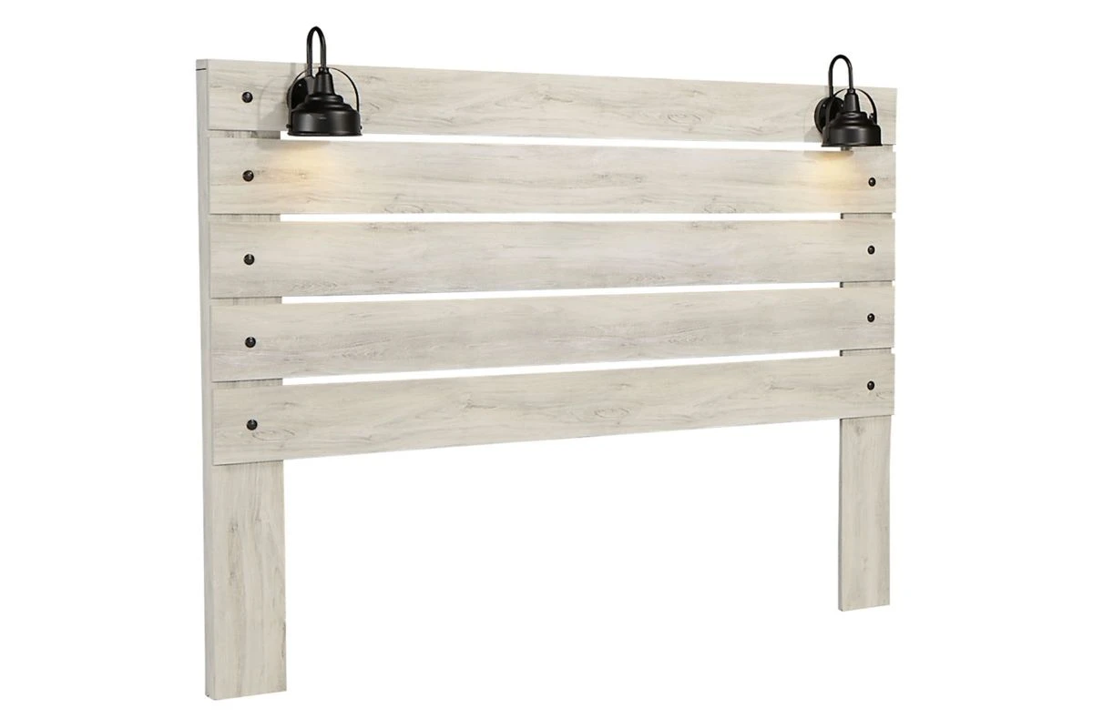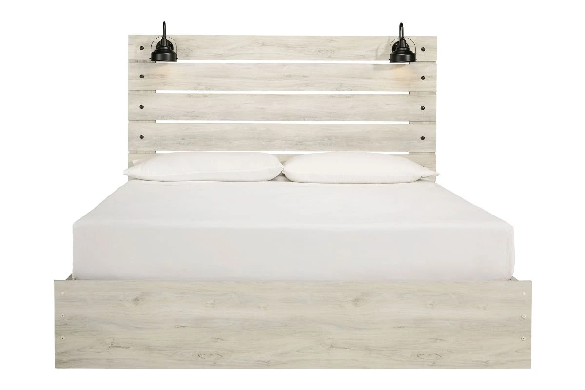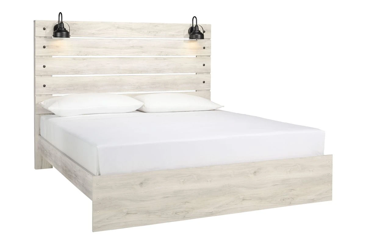 What a delightful take on rustic industrial style. Whether modern loft or modern farmhouse, the Drystan King panel bed makes itself at home. The wispy whitewash palette enhances without covering the grain for that weathered look you crave. Love to read in bed? You’re sure to find the retro-chic light sconces