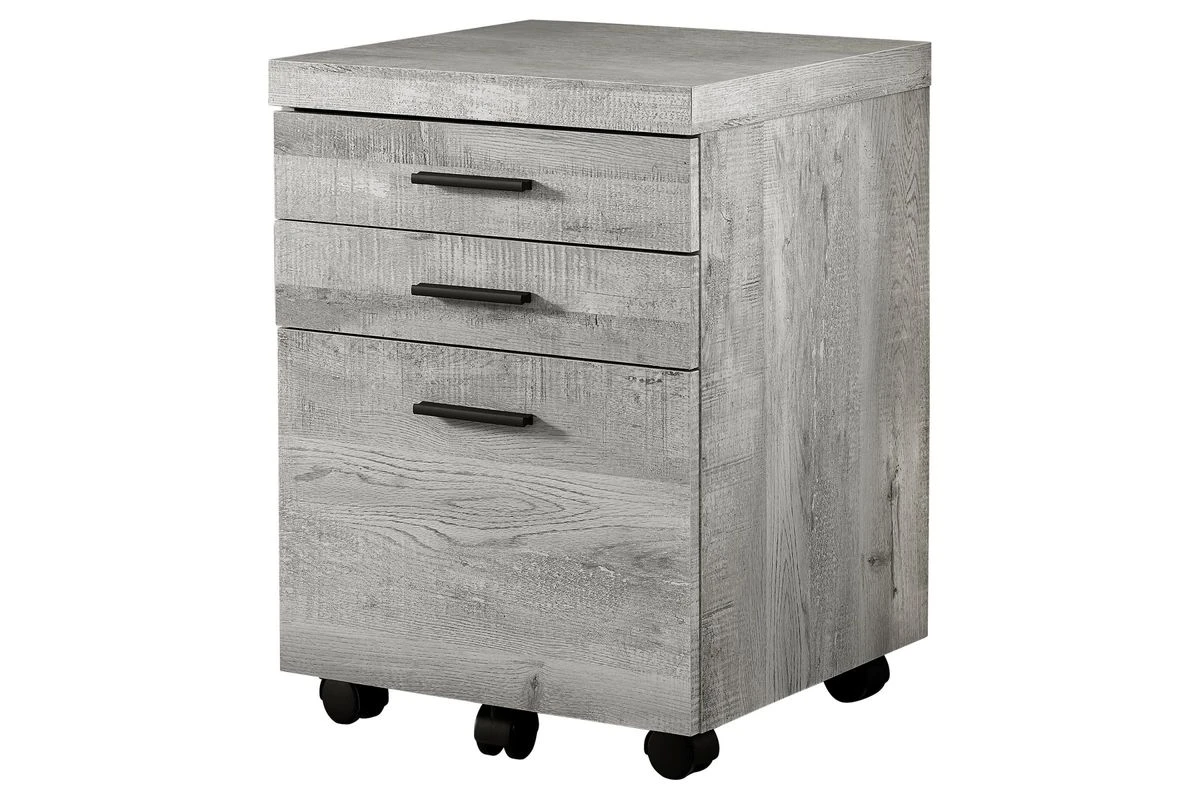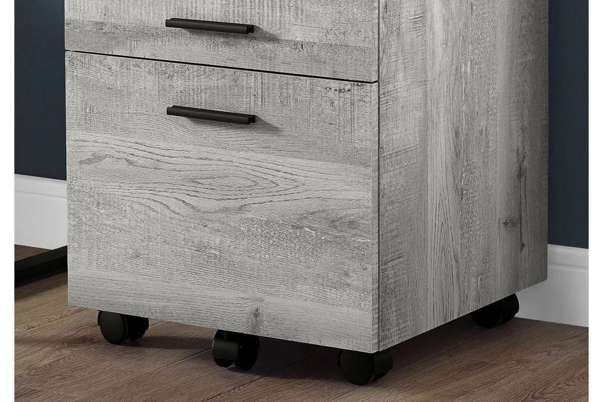 Complete your workstation with this compact and functional mobile file cabinet with a beautiful grey rustic wood-look finish. Easy on the eyes, it can be placed anywhere thanks to 5 casters (2 locking) to complete your collection with matching office desks (sold separately). Also useful as a printer stand, this filing cabinet is there for you to help you reach your potential no matter the task at hand. Two convenient letter sized drawers easily accommodate files, papers, letters or books, while the third and bottom drawer handles legal sized documents so that you have multiple convenient storage options. Accented with simple modern black handles, this unit has no lack of style.
