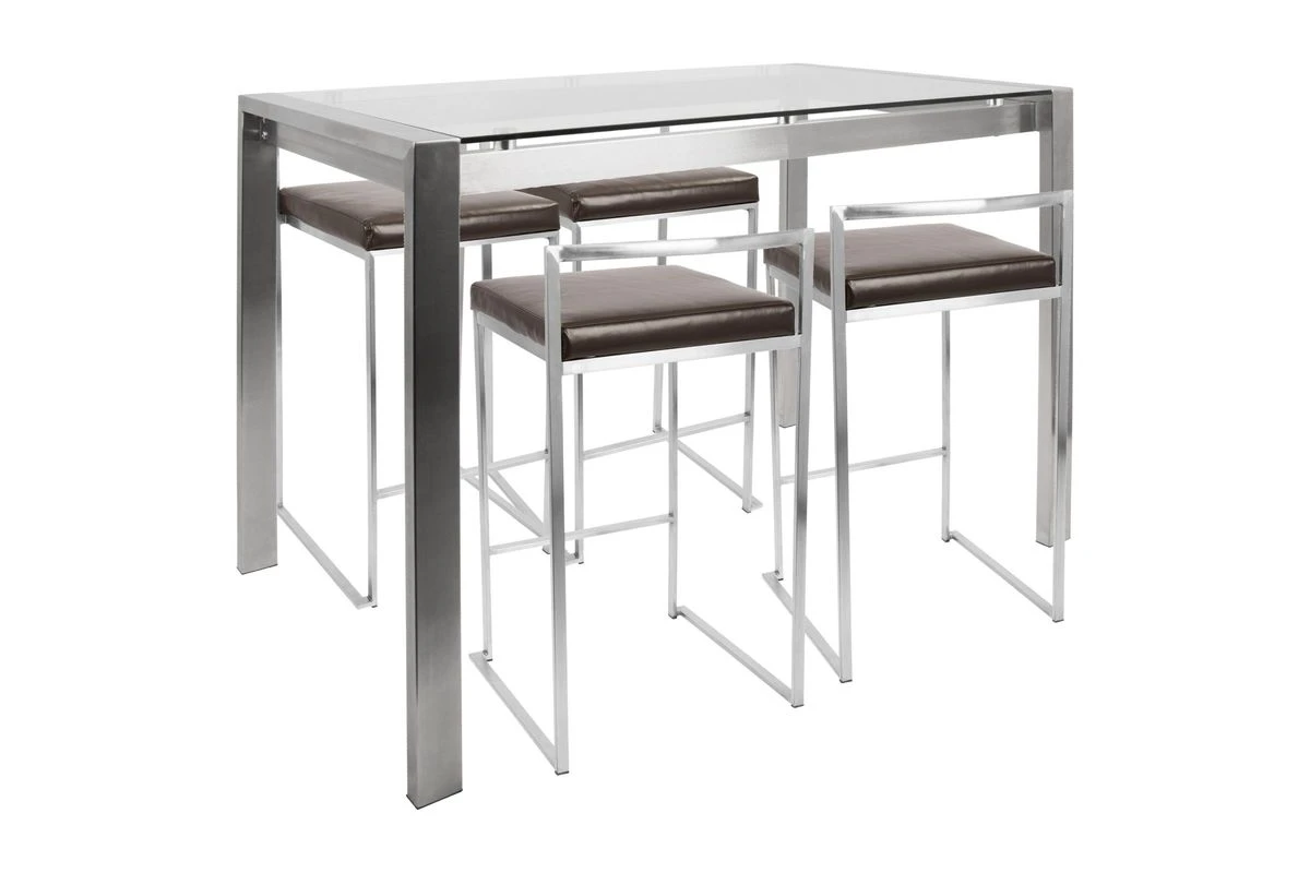 Elegant and substantial, the Fuji Counter Table Set from LumiSource is the peak of streamlined sophistication. This set features brushed stainless steel frames, a tempered glass table top, and fixed height stool with high-performance fabric seats that looks and feels like leather. Includes 1 table and 4 stools.