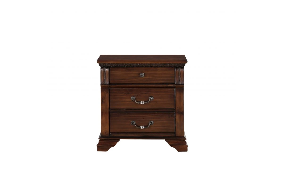 The Goodwin three drawer nightstand allows it to stand out and add to the beauty of the bedroom. Noted for the intricate wood detailing, curved paneling and bracket feet on a rich brown finish, the traditional style of this nightstand is very elegant. The nightstand features three drawers; the top drawer is felt lined, perfect for jewelry and other small items and the bottom drawers contain dust proof paneling for extra protection.