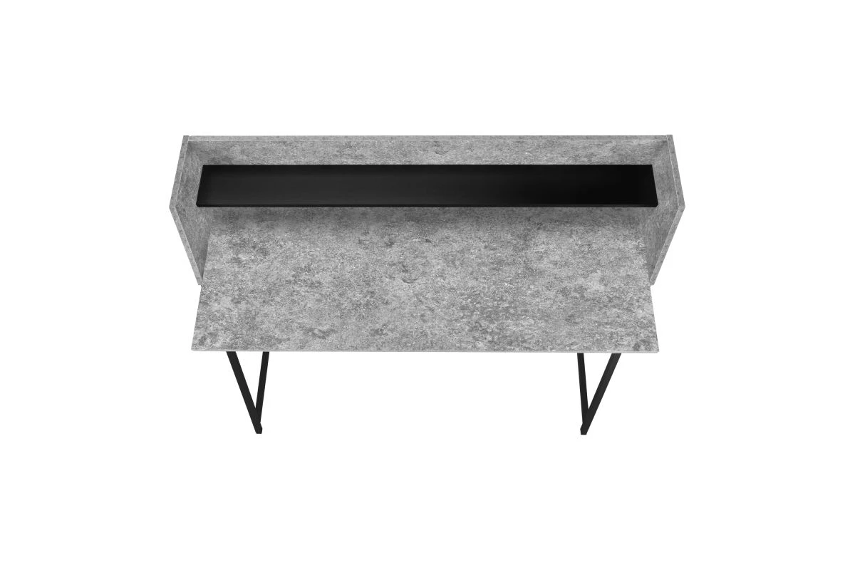 Look at your home office from a different angle with this computer desk featuring a storage hutch. Finished in a grey stone-look laminate, the compact desktop has side panels that slant to seamlessly align with the attractive, trapezoid-shaped metal legs for a clean look. The hutch includes 1 long shelf in a contrasting black finish that is the ideal size to hold small items like wireless speakers or a block of sticky notes. Supporting the desktop is a sturdy metal base in black with a support bar on back that runs parallel to the shelf. This contemporary laptop or writing table with a space-saving design is a great choice if you use your living room or bedroom as a home office.