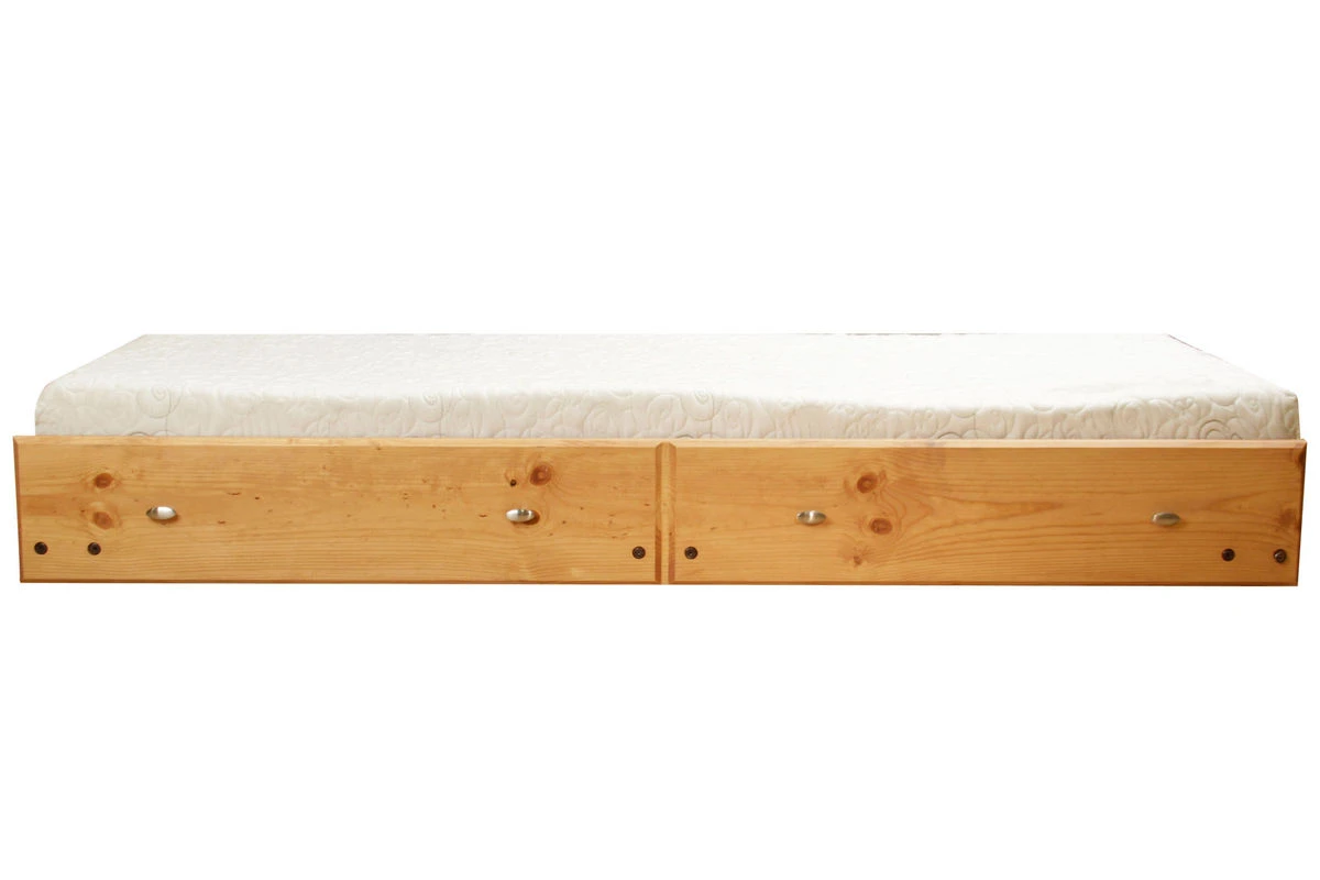 The Laguna Black Mattress Trundle will please even the pickiest of children and teens all while providing enough room for overnight guests. The furniture is constructed with solid Ponderosa Pine, stained a rich caramel color and finished with modern, brushed silver hardware. This trundle fits perfectly under the Laguna Bunk Beds.