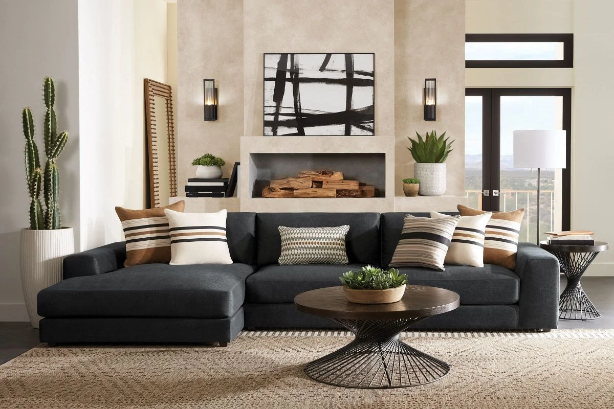 Boasting luxe details like soft onyx chenille upholstery and deep seating, the Lenox sectional from the Cindy Crawford Home collection creates an ideal balance between cozy comfort and chic style. The seat and back cushions are reversible for added longevity and feature a decadent Feather Blend design that conforms comfortably to the body. With room for up to five people, the sectional offers sleek track arms for an appealingly streamlined silhouette, while a set of accent pillows in a variety of patterns adds visual texture.