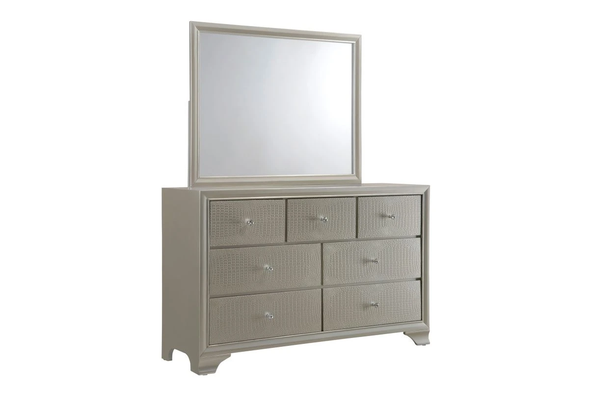 The Lyssa Dresser + Mirror has a style that is decidedly fabulous. This piece has rubberwood French dovetail drawer fronts and an English dovetail back that provides strong construction for everyday use. The modern champagne faux finish with embossed crocodile pattern come together to complete the look.