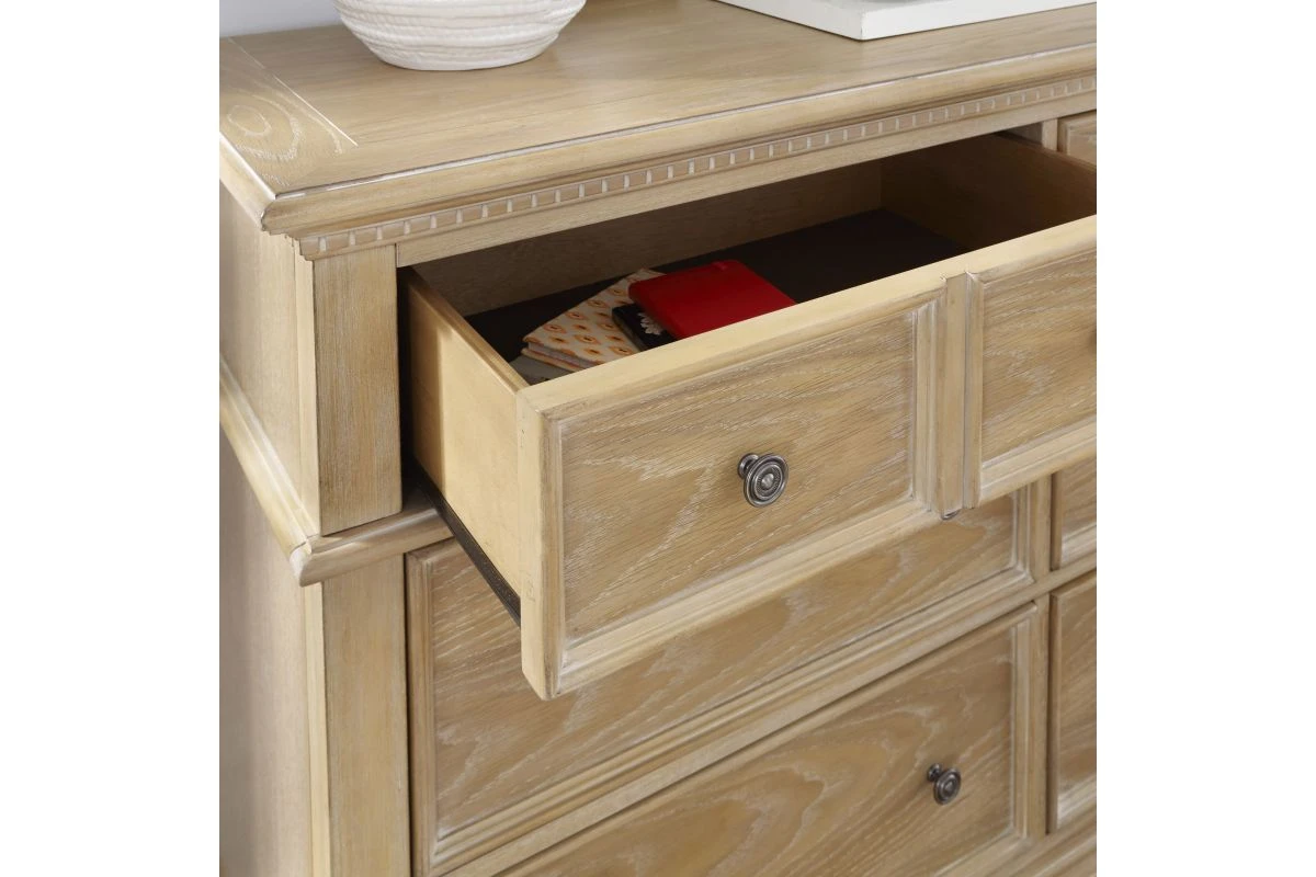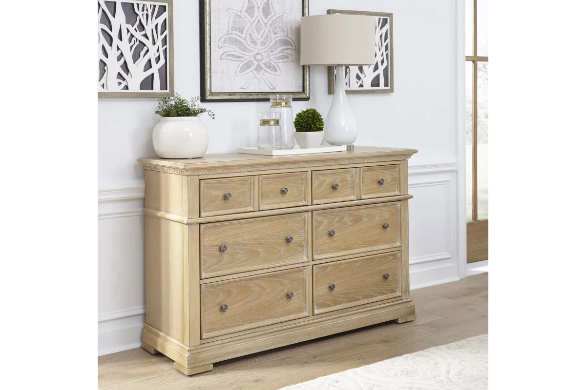 Traditional design with a hint of contemporary. The Manor House Dresser by homestyles is crafted from wire-brushed hardwood solids and white oak veneers over engineered woods with an aged waxed, white oak finish. Features a raised base with block feet and a piano molding under the top, adding to the traditional design. Six deep, equal-sized drawers have outer-edge, picture frame molding and antique nickel drawer pulls. The top two drawers have a faux two-drawer look and felt-lined bottom for more delicate items. Finish and measurements may vary slightly. Assembly required. Arrives at your door by parcel delivery service. Measures: 36″H x 56″W x 19″D.