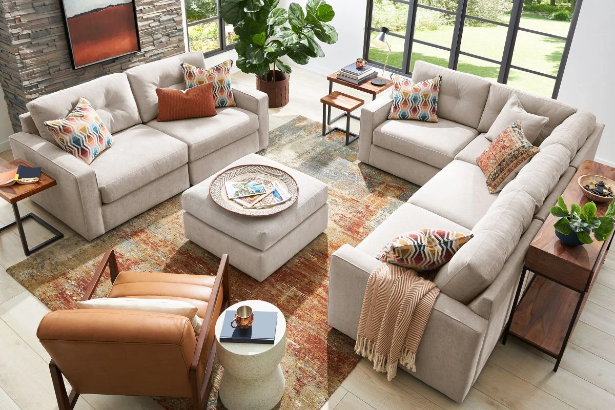 Discover the limitless possibilities of the M1 sectional, thoughtfully designed with comfort and flexibility in mind. This customizable seating solution features individual pieces that can be reconfigured to the shape you need. Game days, movie nights, sleepovers, and everyday relaxation are all better when the seating arrangement you want is always right at your fingertips. Each individual piece is upholstered on all sides in soft, chenille fabric that includes Repreve yarn, made with recycled plastic bottles. The open seating includes a chaise and has welted track arms, top-stitched seat cushions and button-tufted back cushions for an elegant silhouette. Media consoles provide hidden storage, USB charging ports, wireless charging, Bluetooth speakers, and double as side tables with sleek acrylic tops.