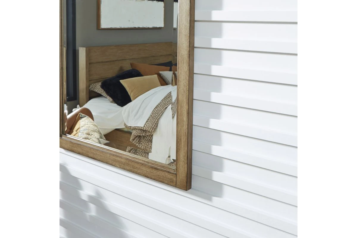 California contemporary design with a slightly weathered driftwood, natural brown oak finish. The Montecito Mirror by homestyles is crafted from hardwood solids and straight grain oak veneers over engineered wood. Solid wood surfaces have a wire-brushed texture, providing a weathered look. Mirror features beveled glass and is backed by an engineered wood backing for added support. Can be hung vertically, or horizontally, and comes with brackets to attach to the back of the matching dresser. Finish and measurements may vary slightly. Arrives at your door by parcel delivery service. Assembly required. Measures: 35″H x 29.25″W x 1″D.