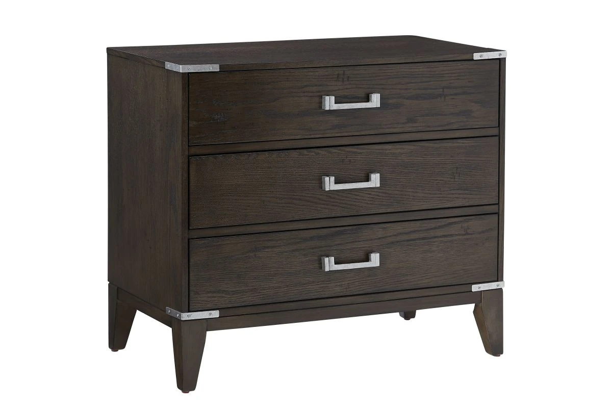 If you want a Nightstand with a stylish design and an adventurous spirit, our Campaign Nightstand is the perfect candidate. Its plywood drawer provides plenty of storage and its brass finished drawer pulls and decorative corner brackets give it a refined touch.