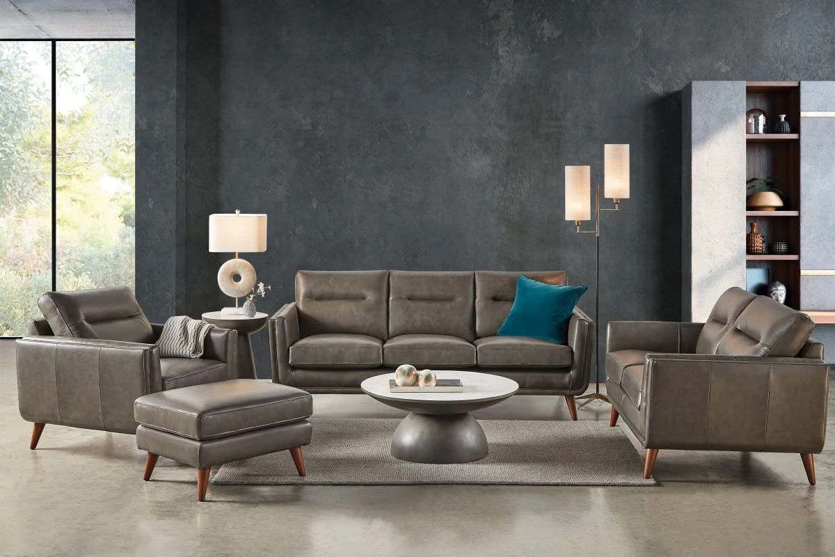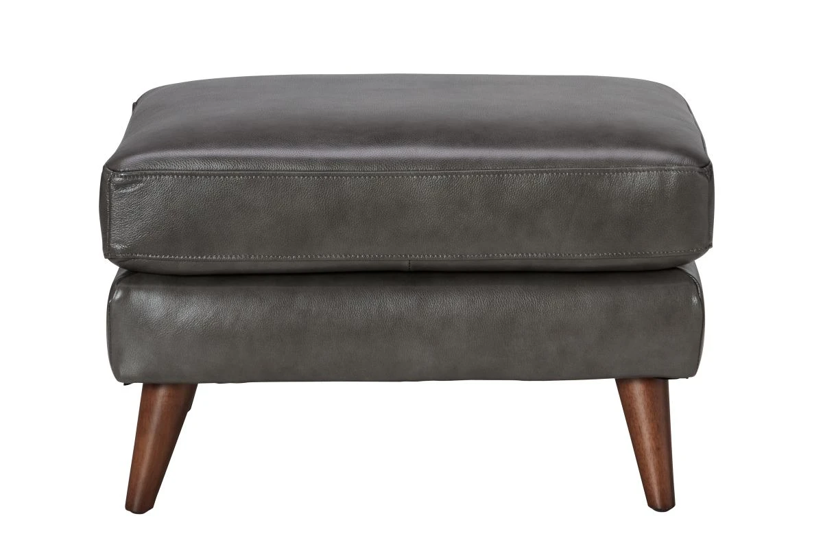 Where classic tradition meets designer style, the Quincy leather ottoman features beautiful details that set the stage for this timeless design. Featuring a mid-century modern design, Quincy displays elegantly crafted flared, tapered legs, clean lines, and neutral earthy tones. The walnut brown wood tone on the legs add the perfect final touch. A seamless mix of foam seat cushions and spring seating provides the right combination for maximum durability and lasting comfort, constructed to stand the test of time.