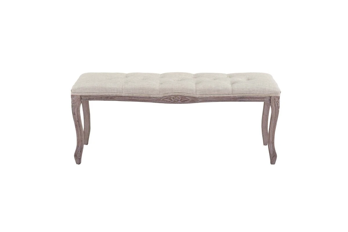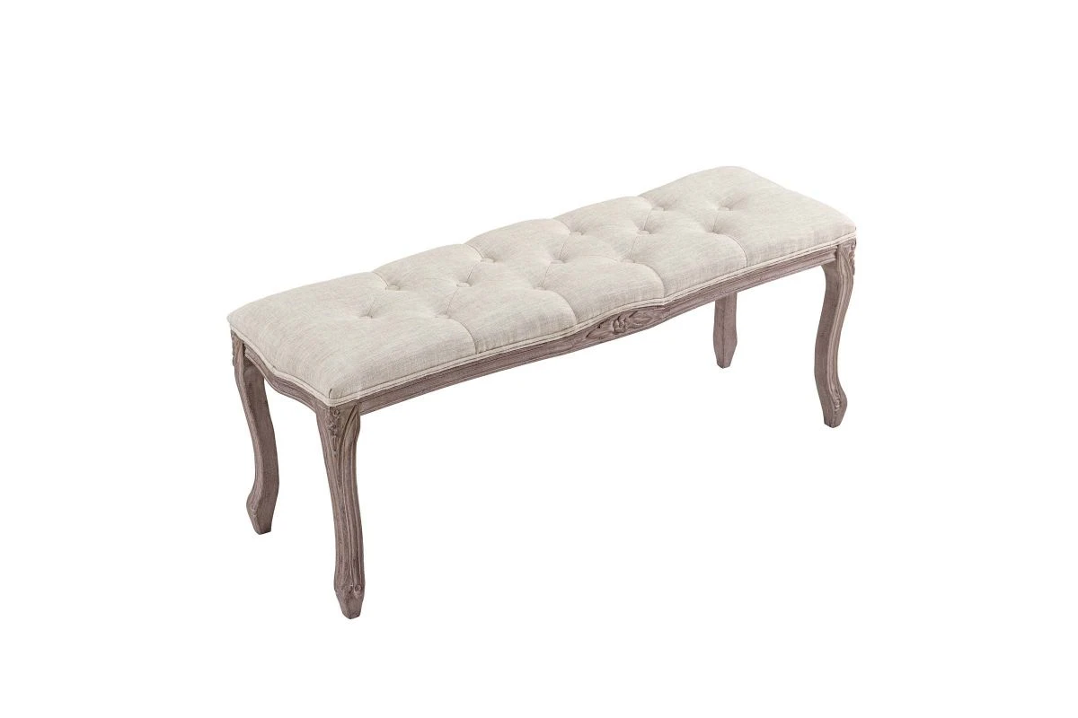 Revel in the whispered opulence of the Regal Upholstered Bench. Featuring a fluted wood frame with elegant cabriole legs, dense foam upholstered fabric seat with welting and button tufting, this bedroom or entryway bench harmoniously blends old world charm with modern intrigue. Designed with a weathered vintage French look and an undeniable appeal, Regal supports up to 331 pounds and comes with foot pads to preserve flooring. Comes fully assembled.