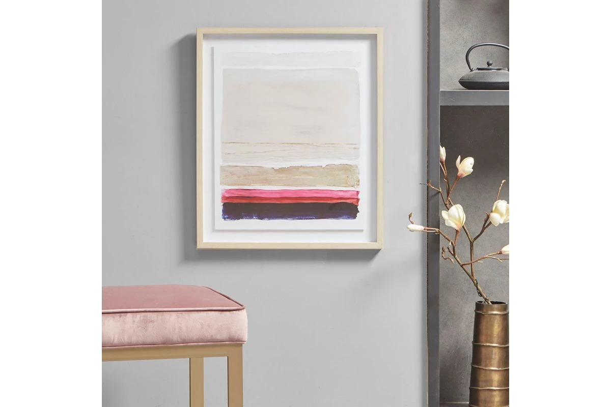 The Martha Stewart RothkoÂ’s Striped II Framed Glass Wall Art Single Matte adds a unique contemporary piece of art your home decor. This framed wall art features a striped graphic, in vivid and natural hues, under glass with a single matte to highlight the modern design. A coordinating frame complements the abstract design to complete the wall art, while two D-rings make it easy to hang on your wall. A part of the Martha Stewart Urban Contemporary Collection, this framed canvas adds a bold and striking update to your living room or home office.