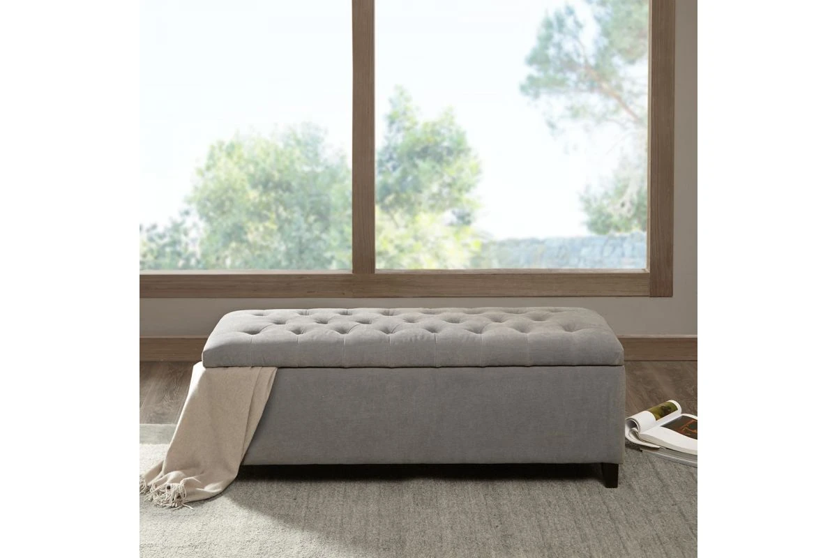 This modern storage ottoman accentuated with button tufting provides ample storage and features an elegant grey soft fabric with rich black legs. No assembly required