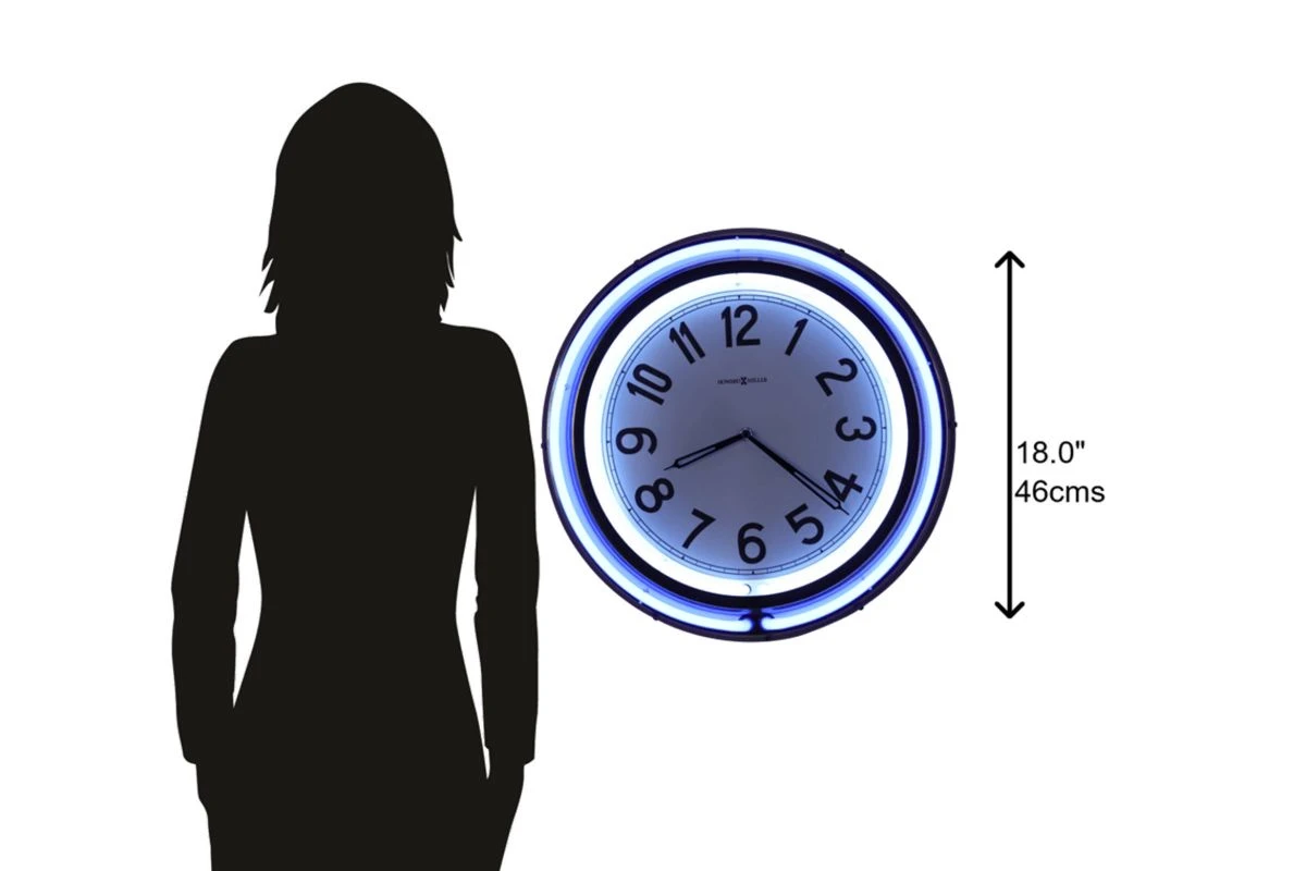 Never miss a beat with this neon metal clock on the wall. This striking accessory is just as much an avant-garde showpiece as it is a throwback testimonial to the 1980s. The unique style captures attention at a glance, not only for its sharp colors but also its depth and vivid numerals. If there’s a surefire way to turn attention to a wall, it’s with a metal wall clock bathed in neon. The soft glow comes courtesy of an inner white ring and a blue outer ring, both powered by an included UL Listed adapter. The effect is cool, crisp, and flawless, particularly as they shine against the bright white dial in the center. It’s adorned with black Arabic numerals and black finished hands behind a flat glass crystal.
