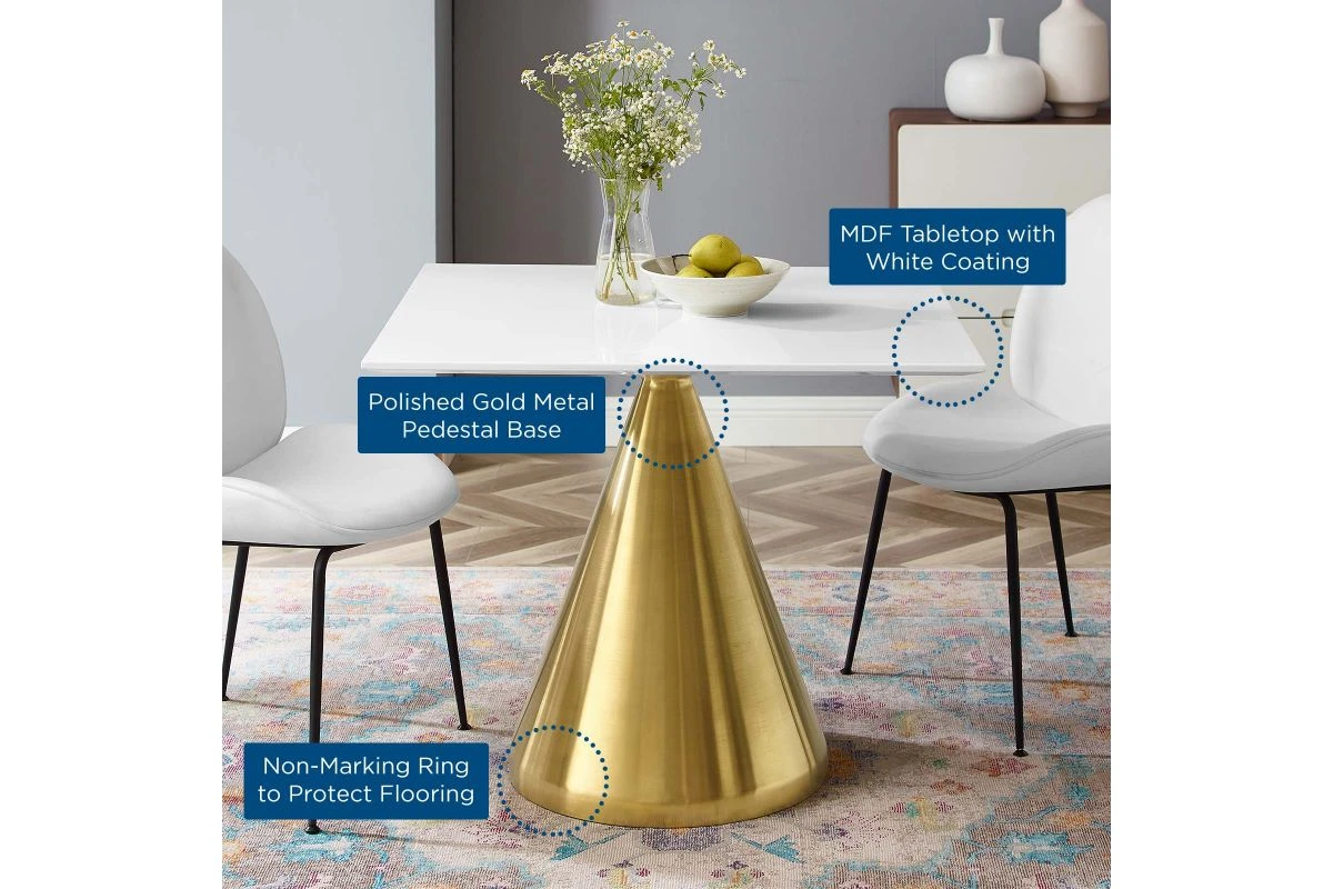 Connect with family and friends over good food and conversation with the Tupelo 36″ Square Dining Table. Inspired by modern style and mid-century influence, this pedestal table reflects an organic shape and is perfect for entertaining or everyday dining. This dining table rests on a conical polished gold metal pedestal base and features a square 36″ tabletop crafted with MDF with an easy-to-clean white coating. Non-marking ring to protect flooring. Assembly required.