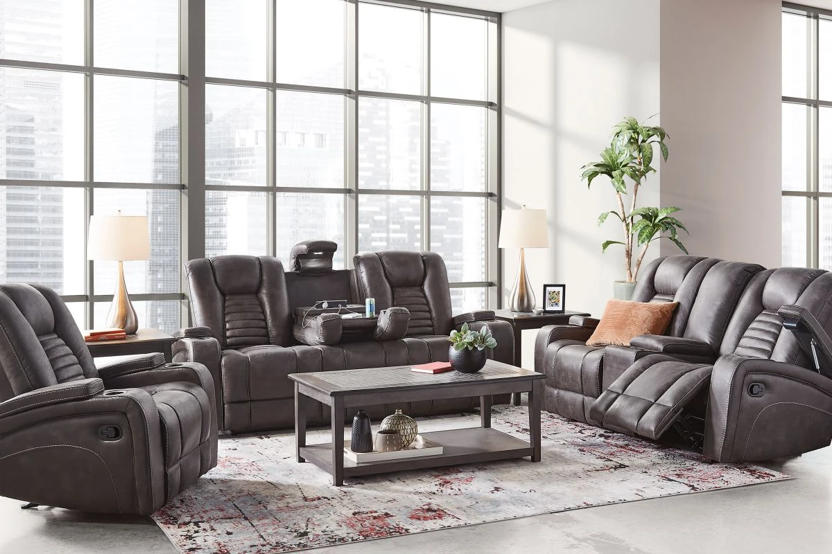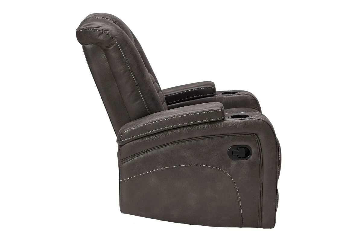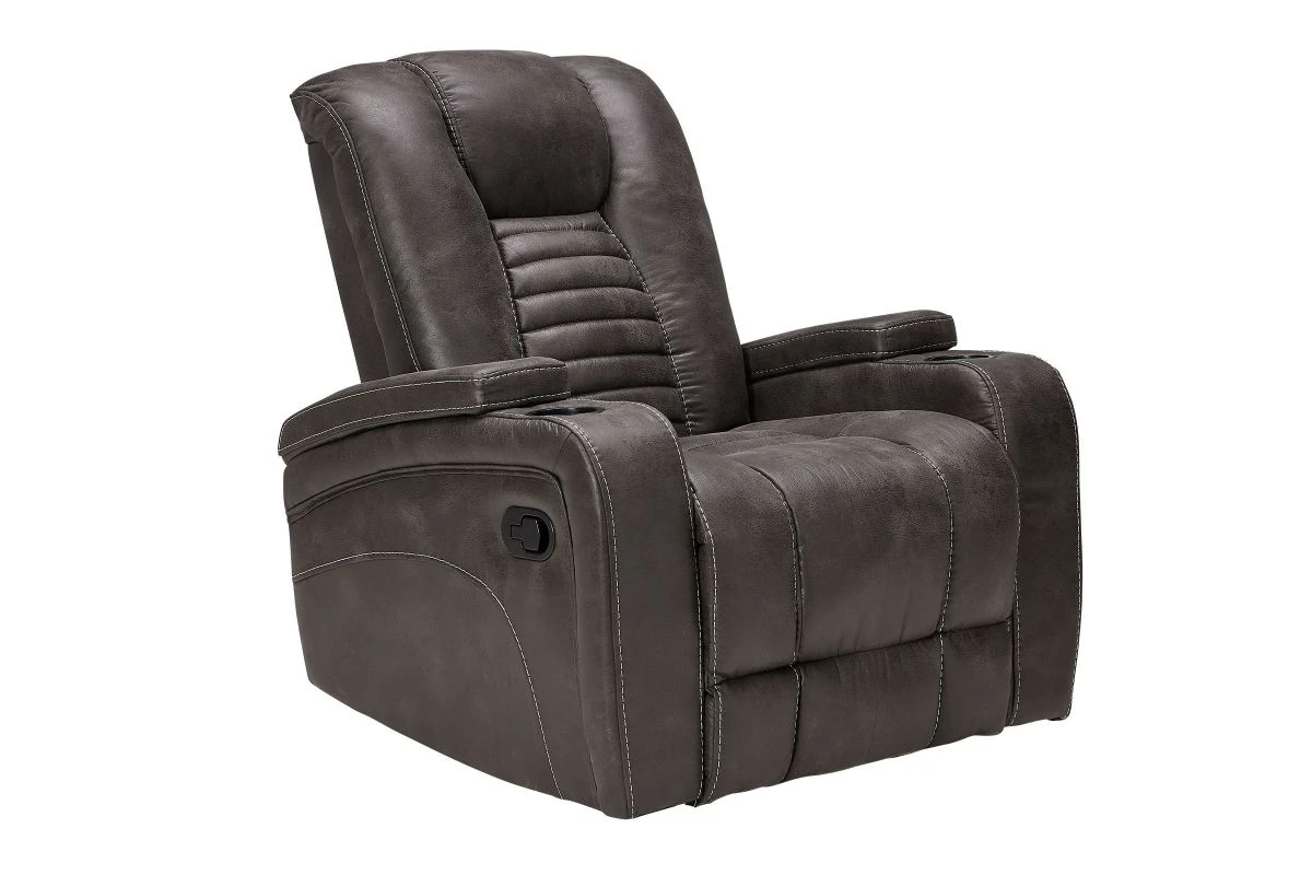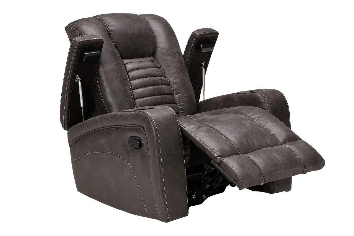 Stylish, innovative and comfortable, the Vance Glider Recliner has it all. Upholstered in a grey polyester fabric, the soft hand of this fabric will entice you to relax for hours. Equipt with a fully loaded armrests that include two cupholders and hidden storage, the Vance Glider Recliner is the ideal spot for entertaining guests. The innovative design of this collection continues with two hidden storage armrests, also fully loaded with cupholders. The luxury vehicle inspired backrest adds visual appeal to this robust bold and handsome collection. Add the Vance Glider Recliner to your home for the theater-worthy living space that you have been longing for.