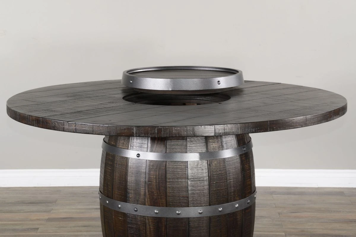 The Vineyard pub table will bring both style and function to your home. With a tobacco leaf finish, this stylish pub-height table has a rough sawn distressing with mahogony solids and veneers. The barstools are featured with a one-slat back and cushion seat for comfort, and swivel capability.This pub is completed with a lazy susan and built-in storage, which brings practicality along with it’s rugged style.