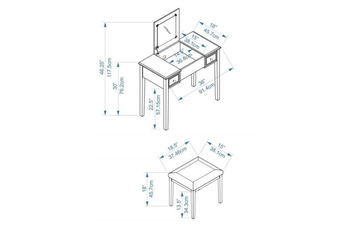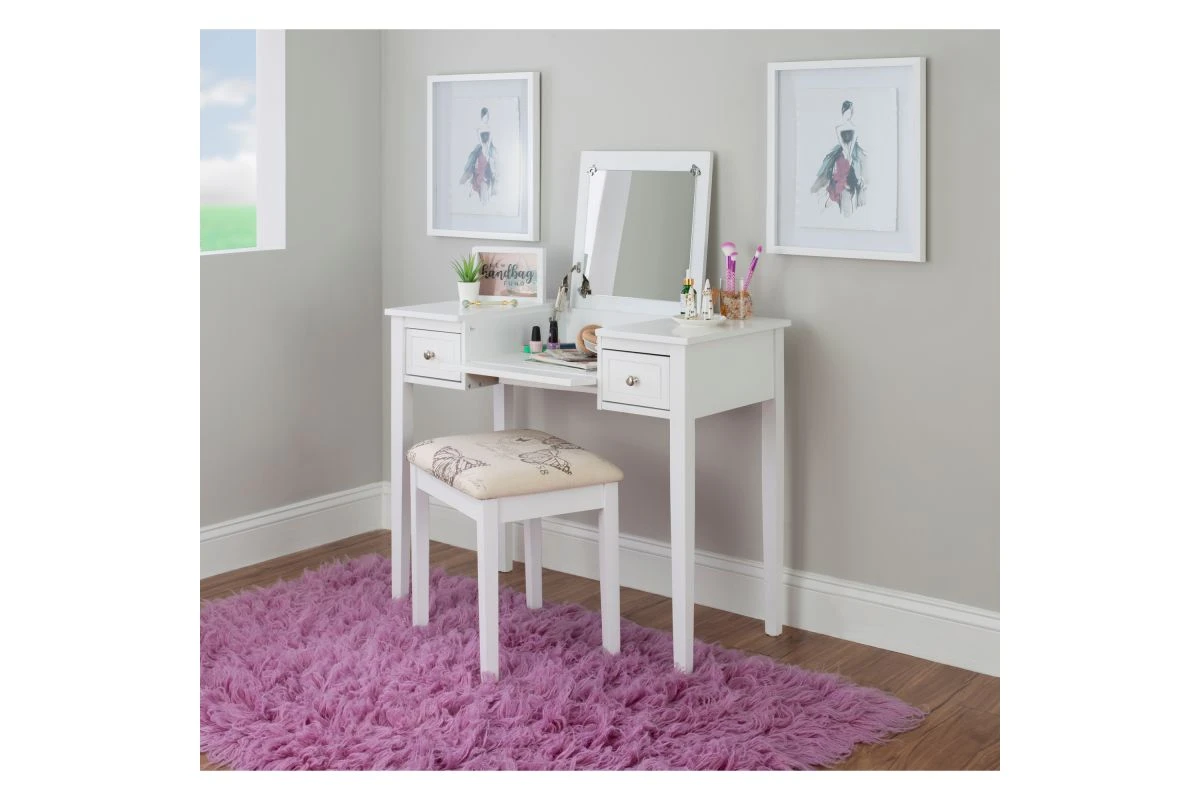 Add style and function to a bedroom or dressing area with the White Butterfly Vanity Set. The vanity features a flip top mirror with a safety stay hinge and generously sized drawers. The spacious table top has room for an array of cosmetic, jewelry and beauty supplies. Flip down front panel for easy access to your possessions. The vanity is complimented by a thickly padded upholstered stool. Ideal for teens and adults. Some Assembly Required