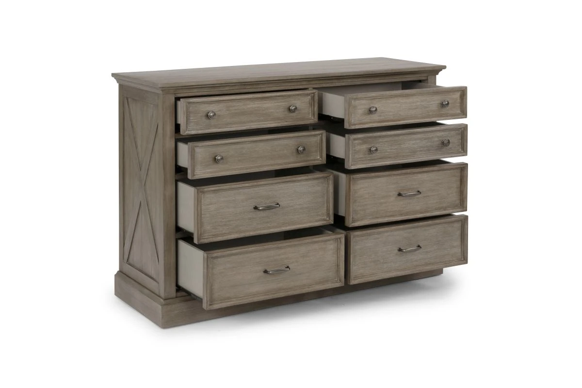 Rustic casual design that is equally at home in a Walker or mid-town loft. The Walker Dresser by homestyles is crafted of mahogany solids and veneers with engineered woods and wire-brushed surfaces, providing a rough-hewn look. Inset wainscot panels with X-frame design. Finished in a multi-colored gray that adds unique highlighting to the design. The top two drawers feature felt-lined bottoms to protect delicate items. Drawers are framed and feature antiqued nickel-finished drawer pulls. Arrives at your door by parcel delivery service. Finish and measurements may vary. Assembly required. Meaures: 36″H x 54″W x 18.75″D.
