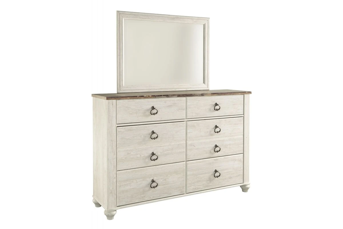 The Willowton Dresser + Mirror is that beautiful farmhouse bedroom collection you’ve been waiting for. It features a two-tone finish in white wash and a replicated wood grained block pattern. The Willowton Dresser + Mirror shows its character through bun feet and ring pull hardware in an antique brass color. Made with side roller glides for smooth operating on all drawers.