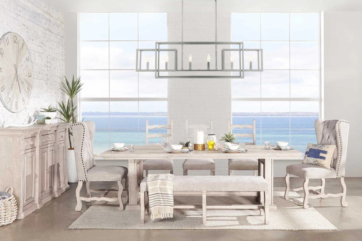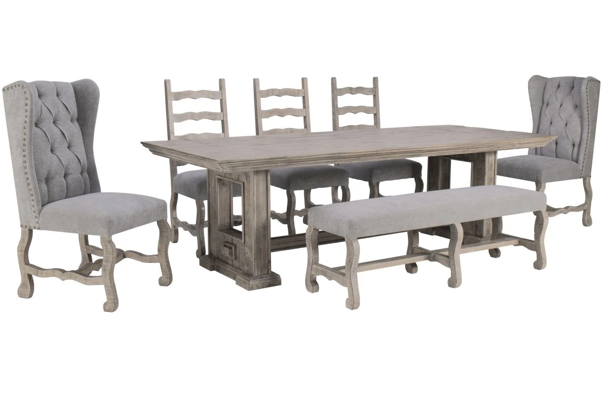 The Wimberly Bench stands out on its own. The dining bench features gorgeous carved wood legs that are accented by a soft grey linen upholstered seat with individual nail head accent trim.